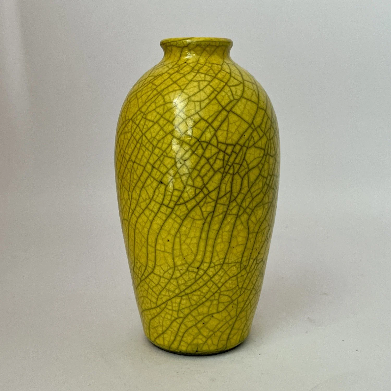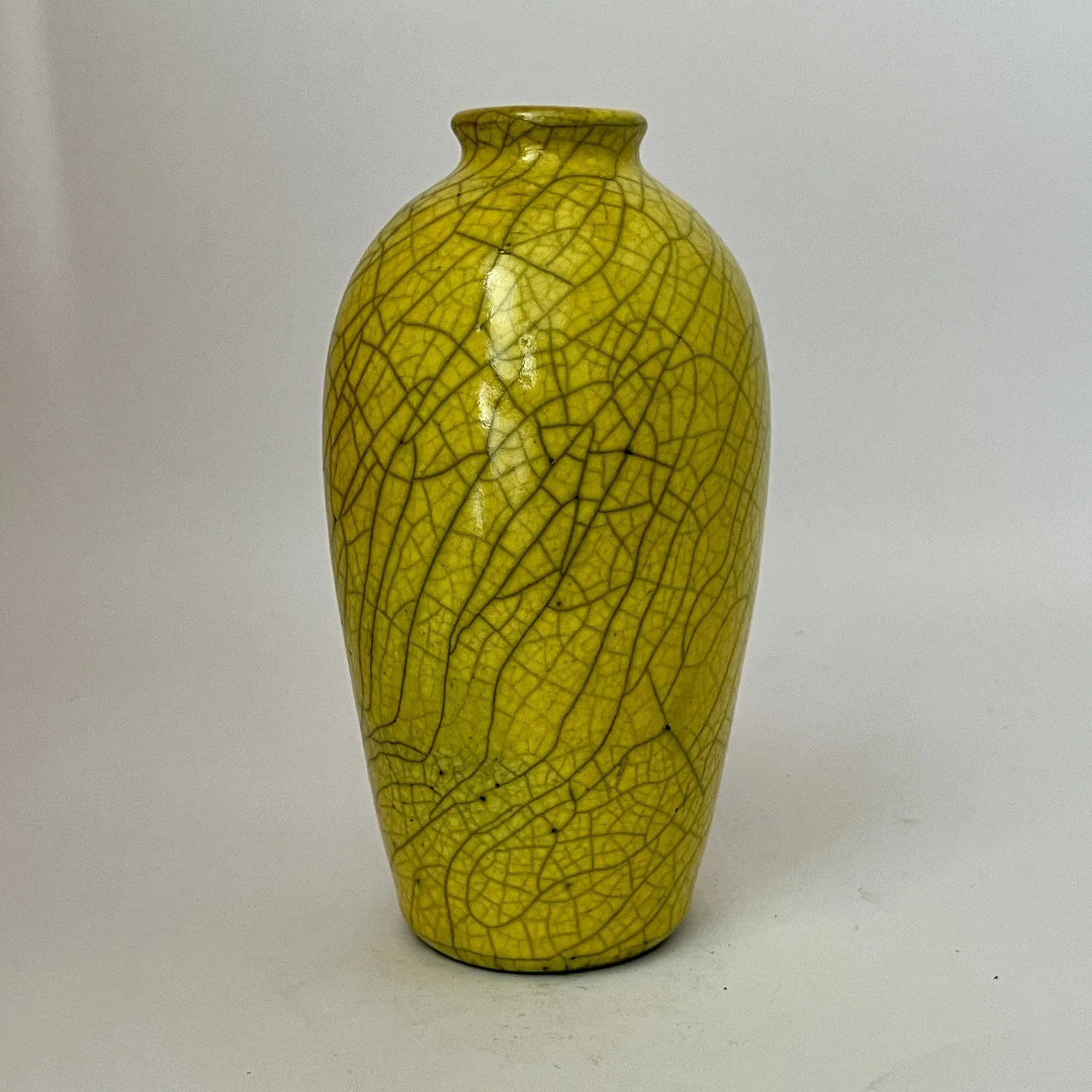 Wheel-thrown, covered with canary crackle glaze and reduction fired. Will not hold water.