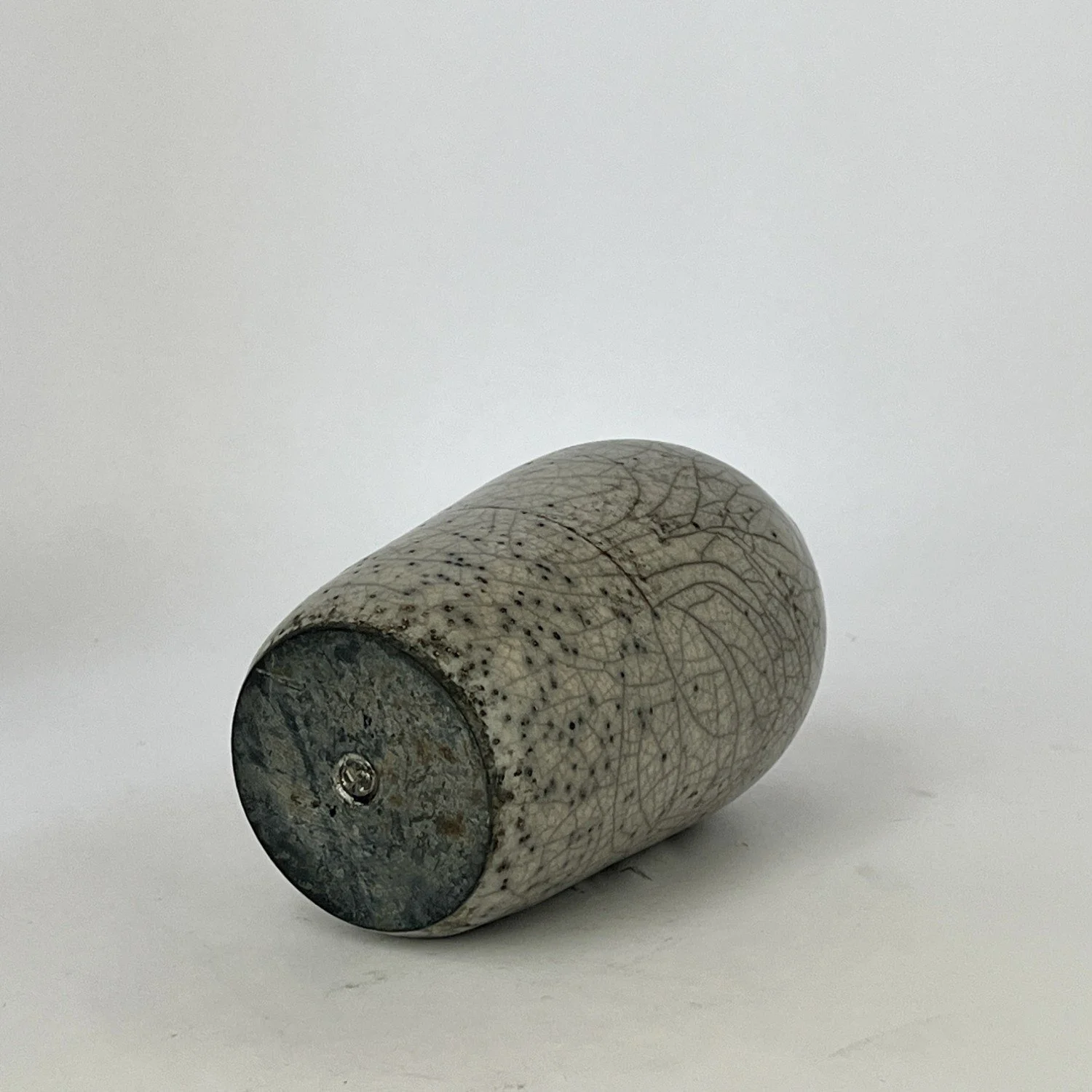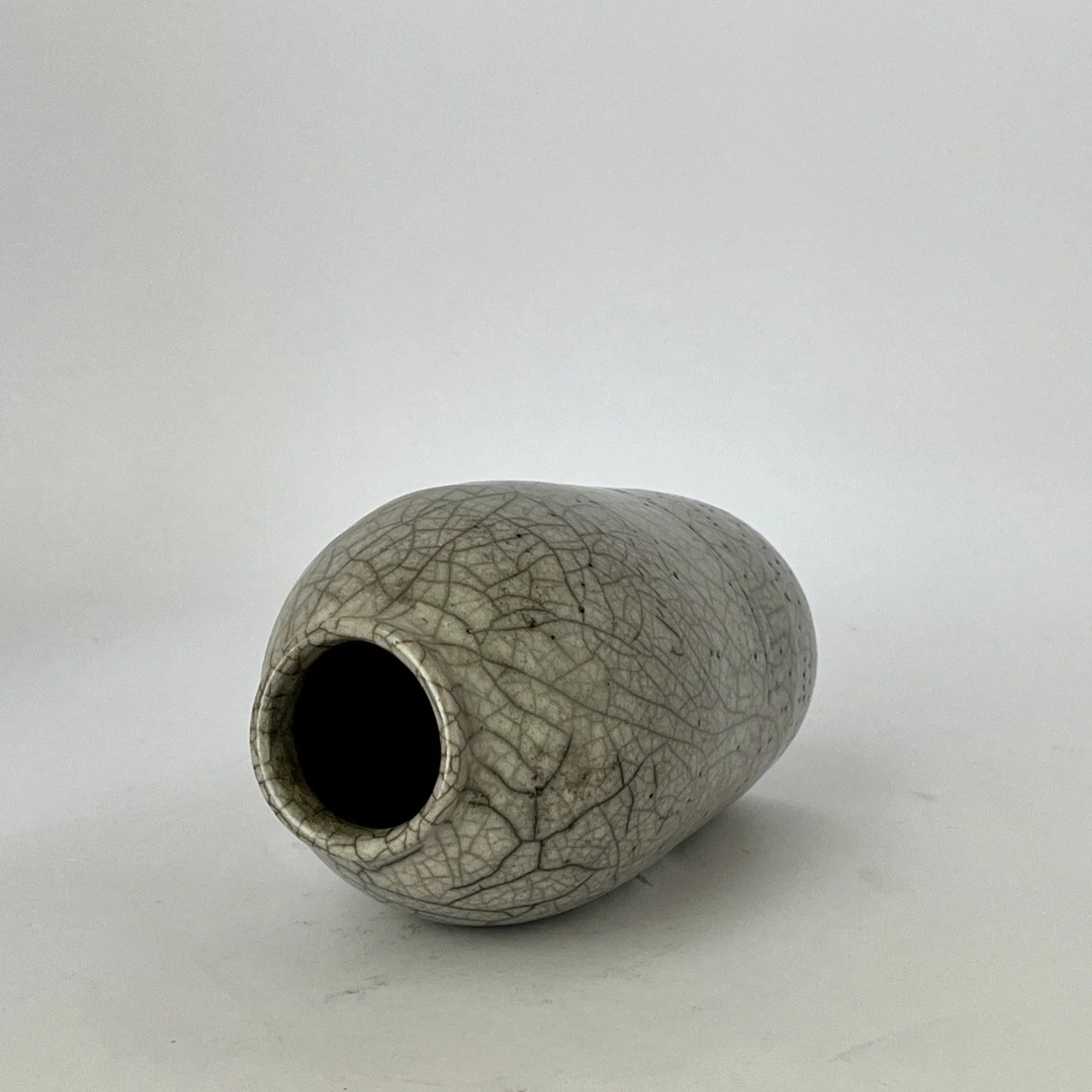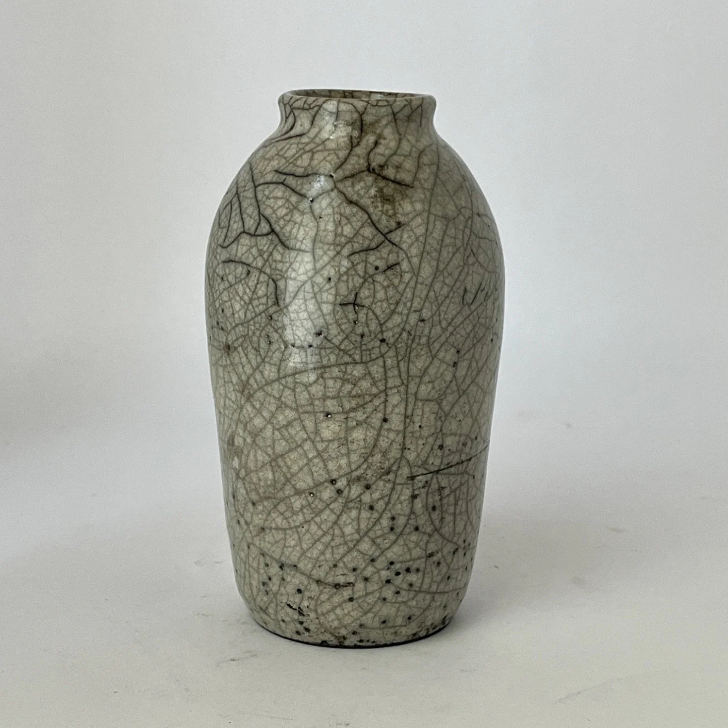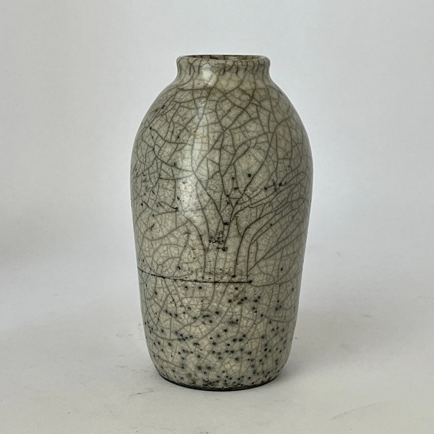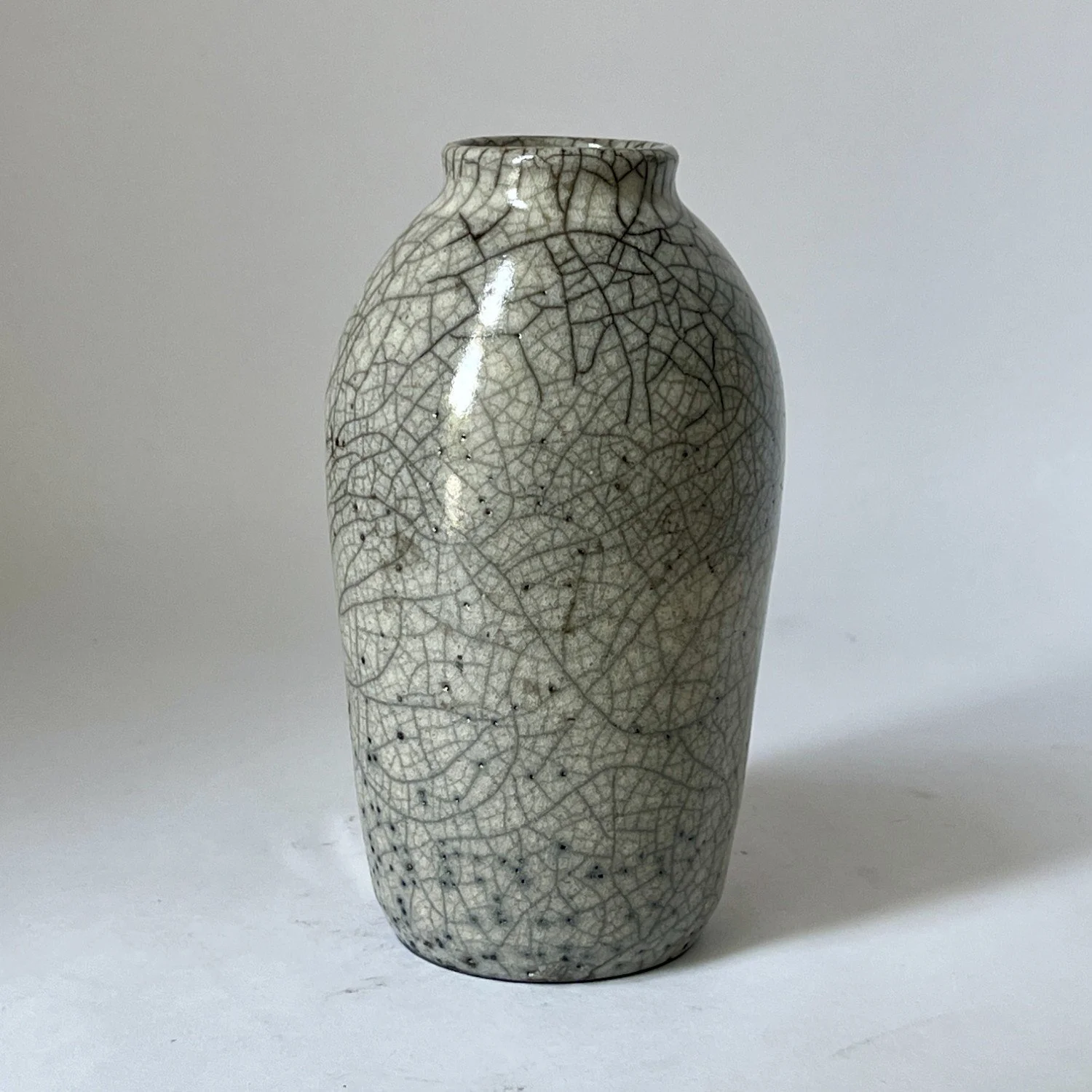 Wheel-thrown, covered with clear crackle glaze and reduction fired. Will not hold water.