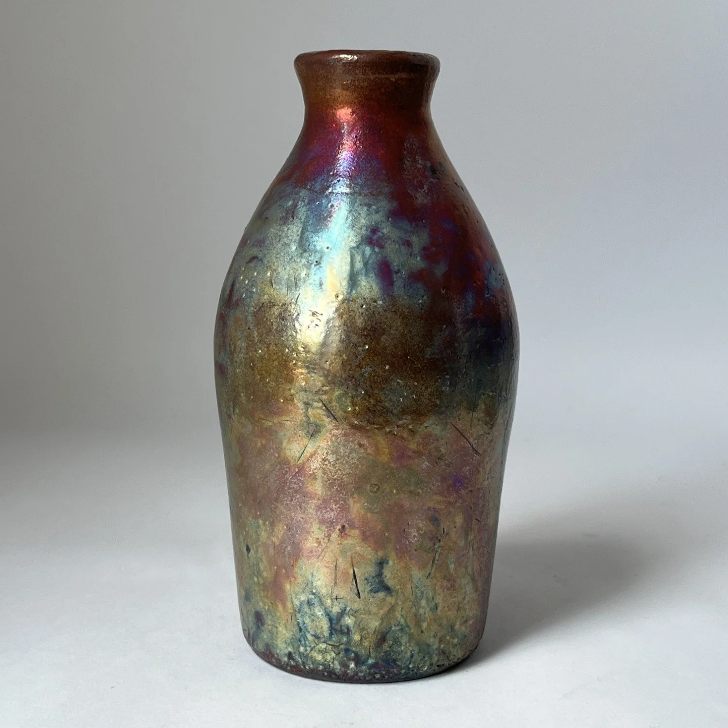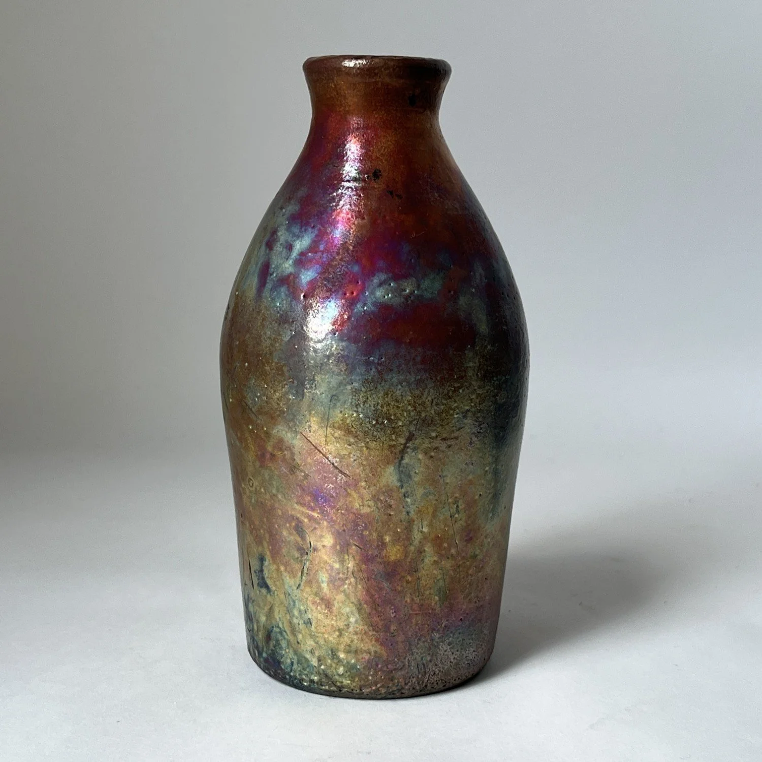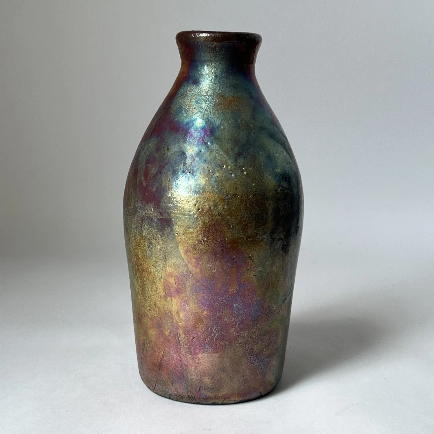 Wheel-thrown, covered with luster glaze and fired multiple times in reduction. Will not hold water.