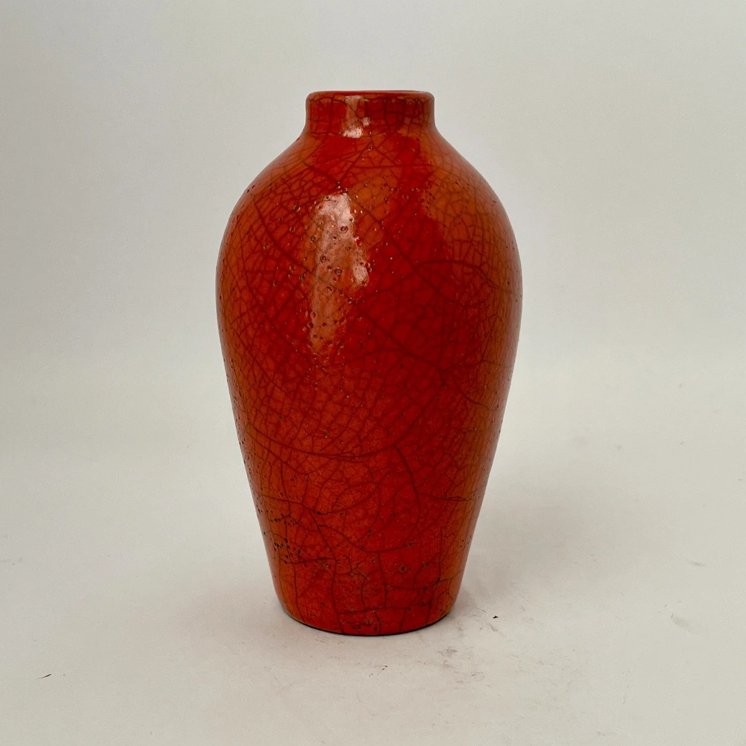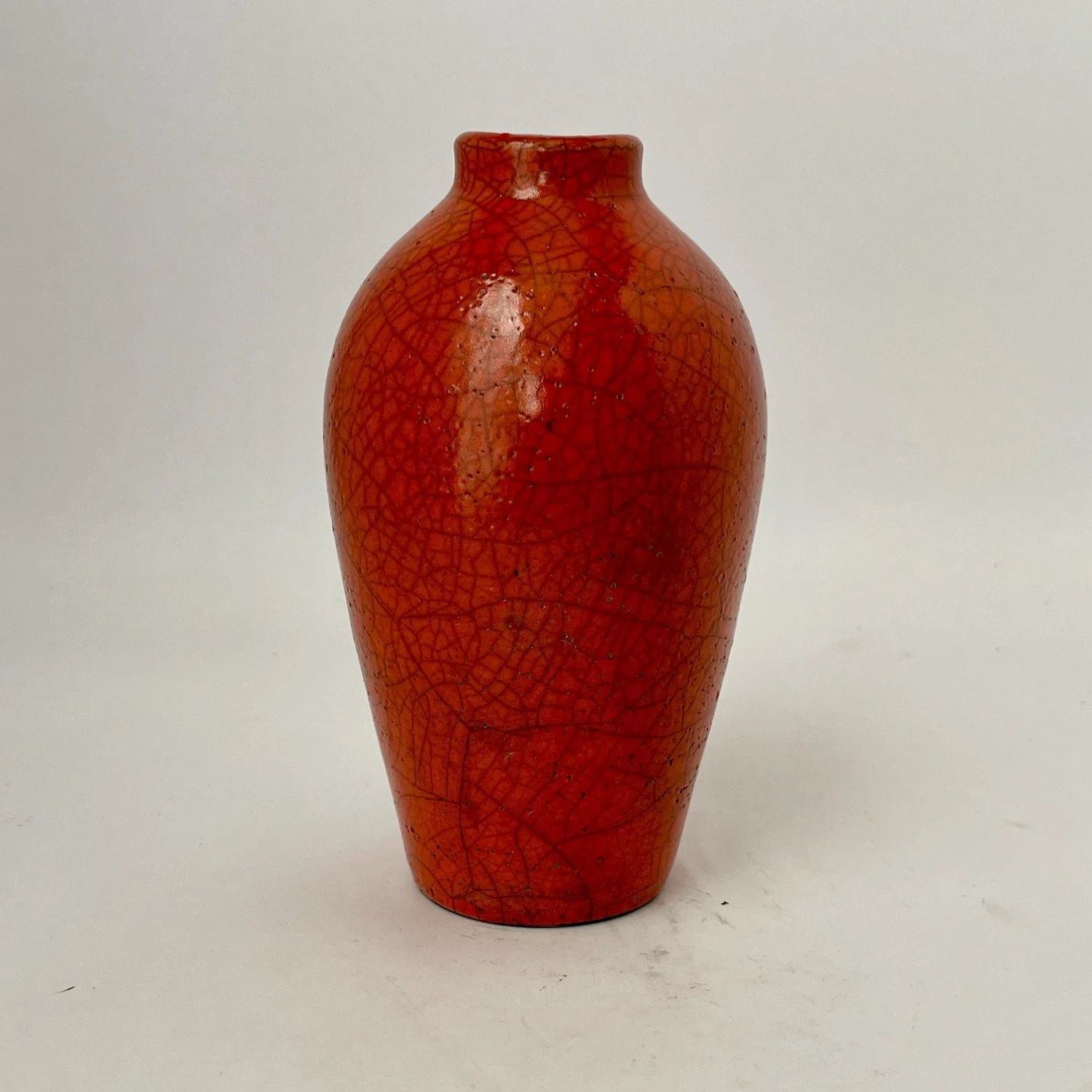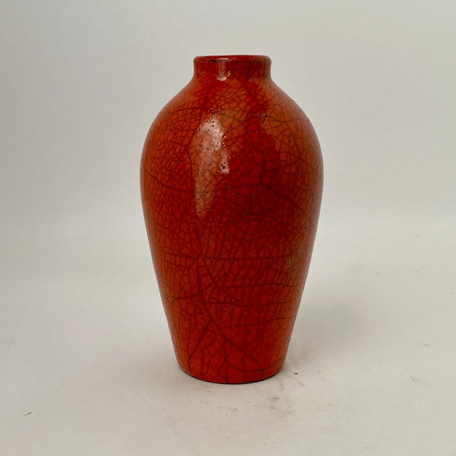 Wheel-thrown, covered with mango crackle glaze and reduction fired. Will not hold water.