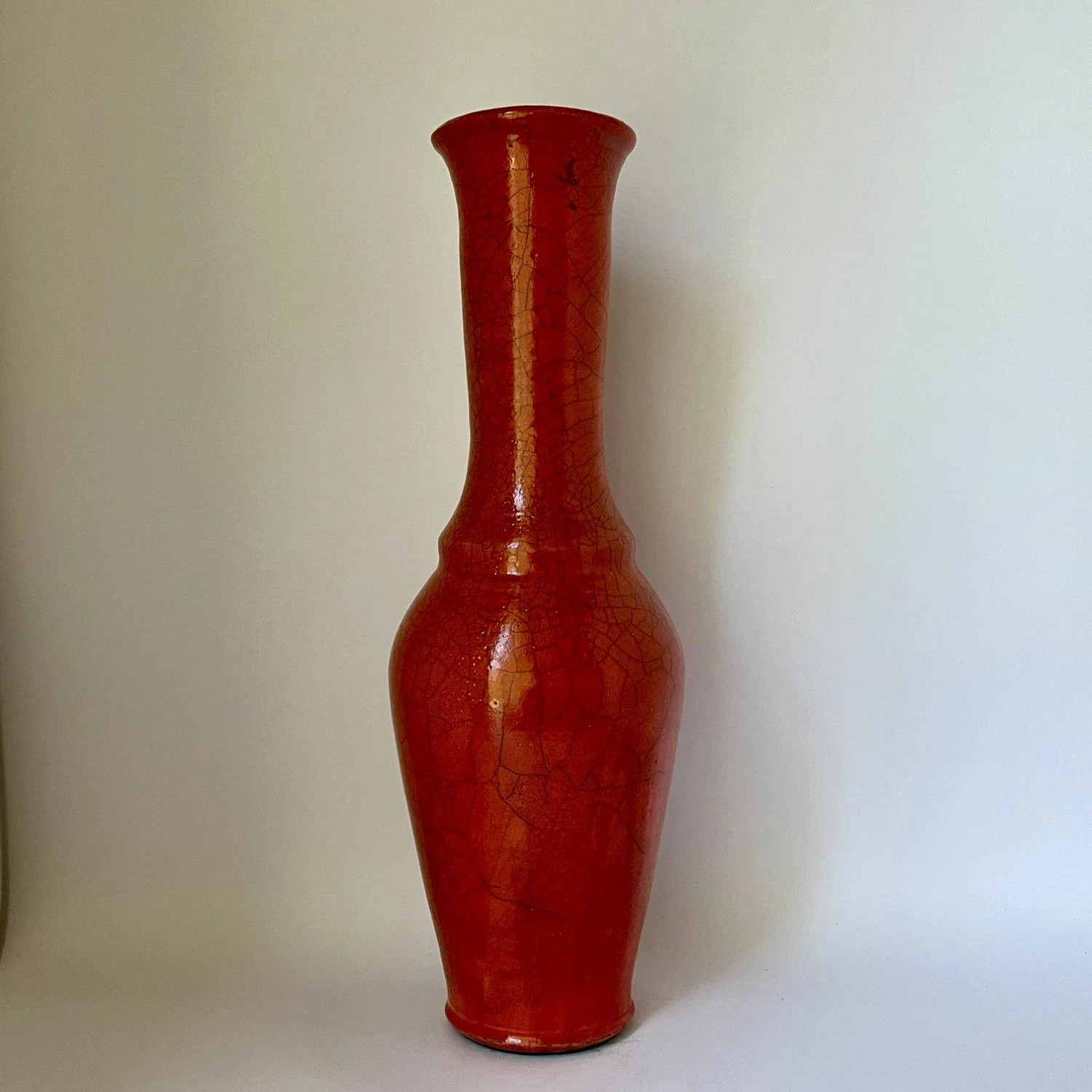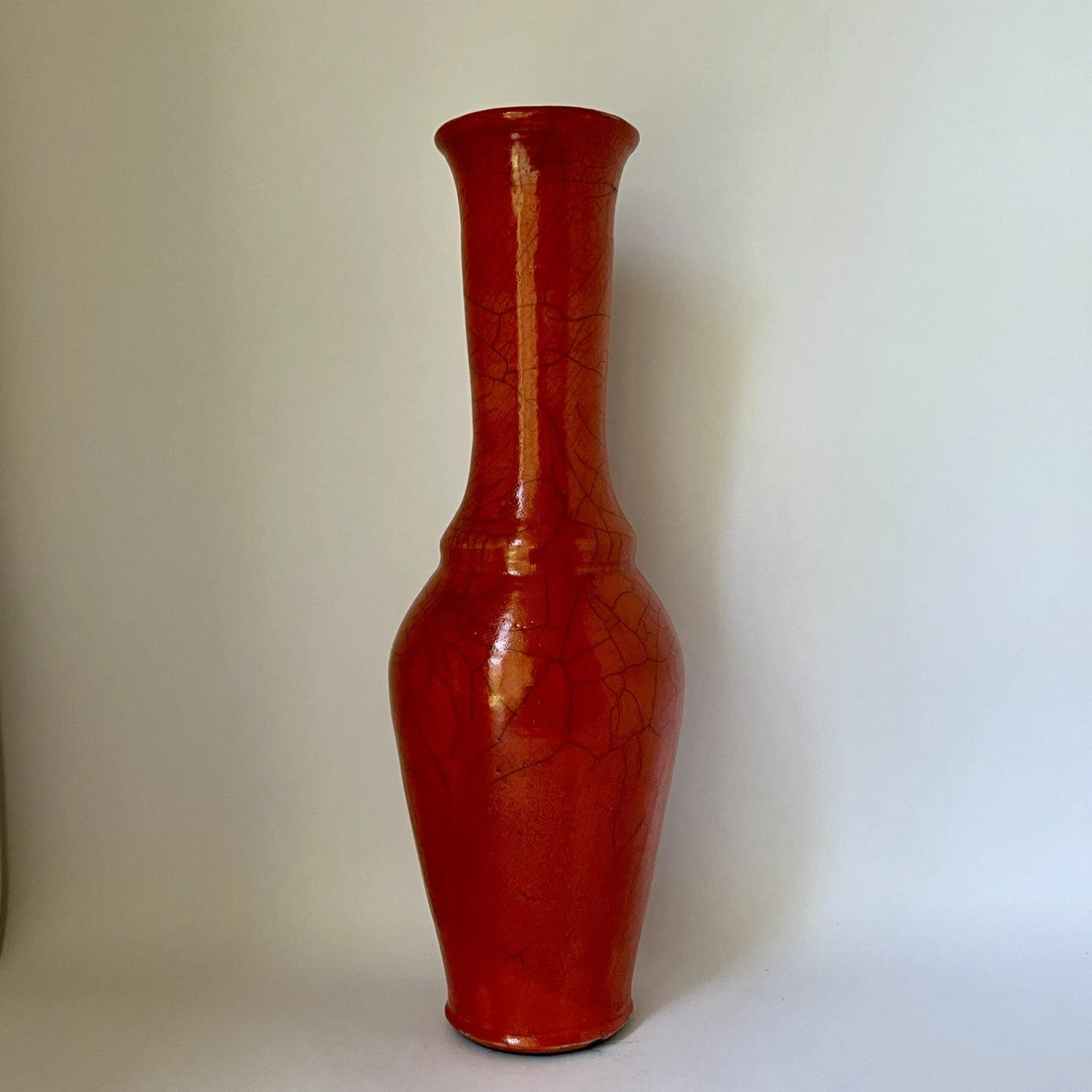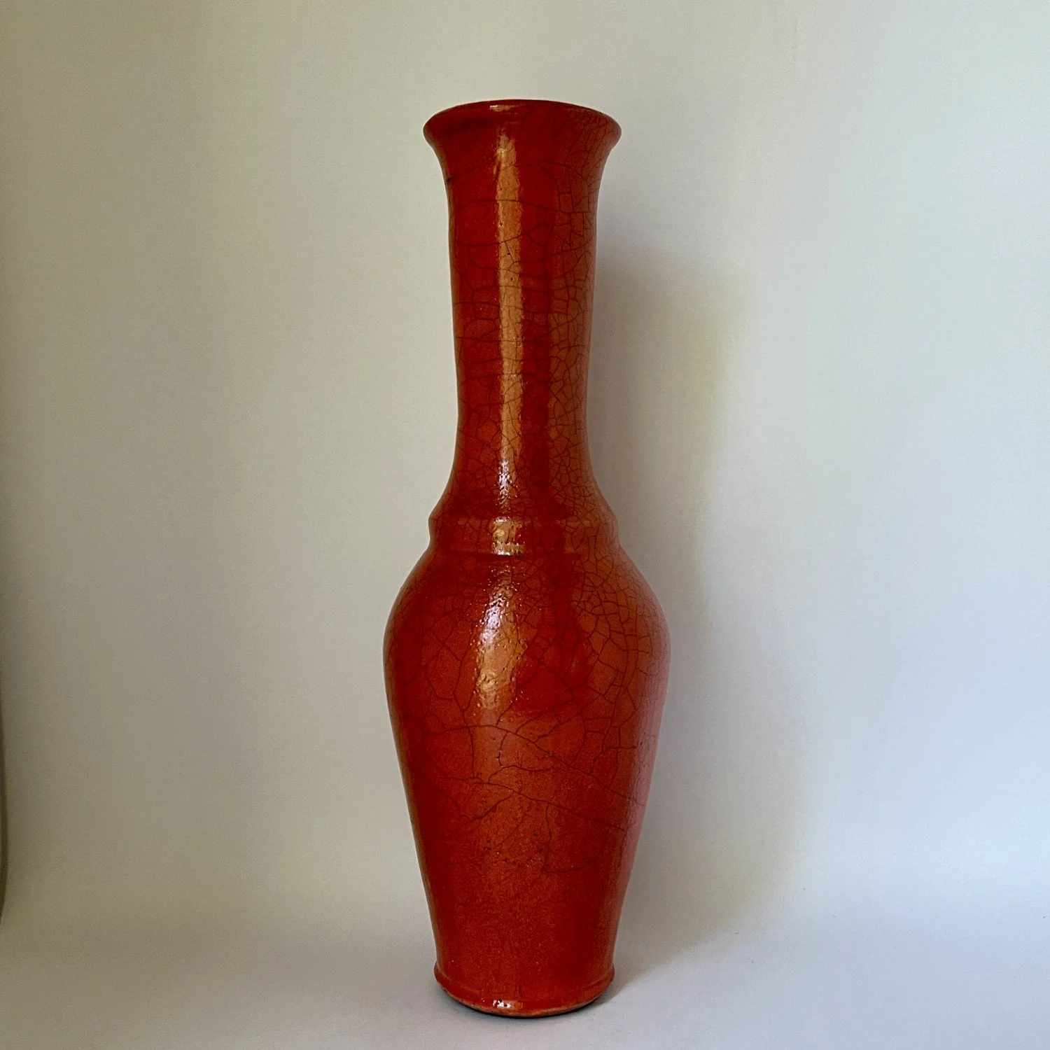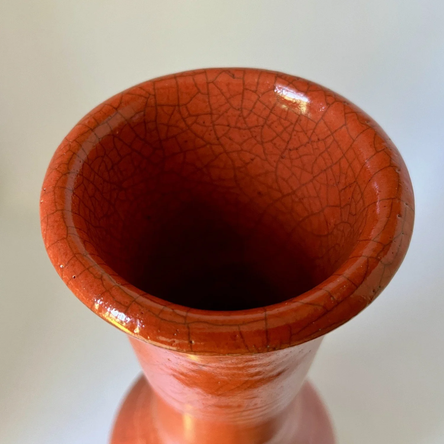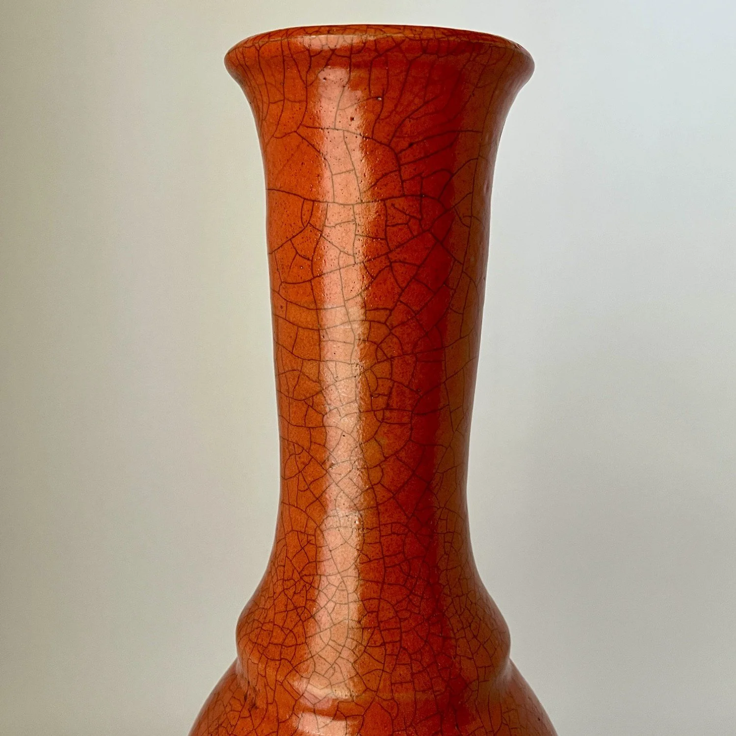 Wheel-thrown, covered with mango crackle glaze and reduction fired. Will not hold water.