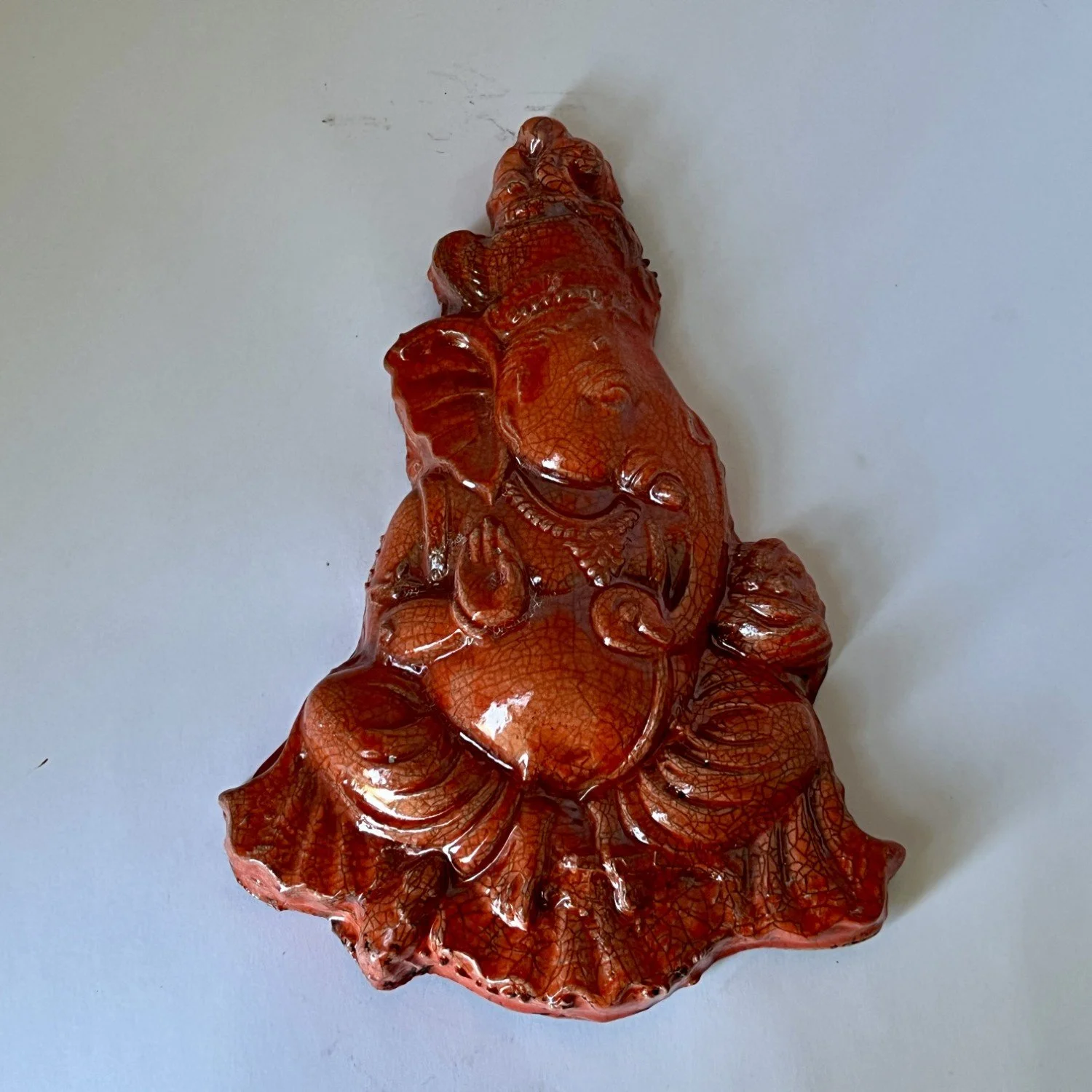 Wall hanging. Hand-built using mold made from original, covered with mango crackle glaze and reduction fired.