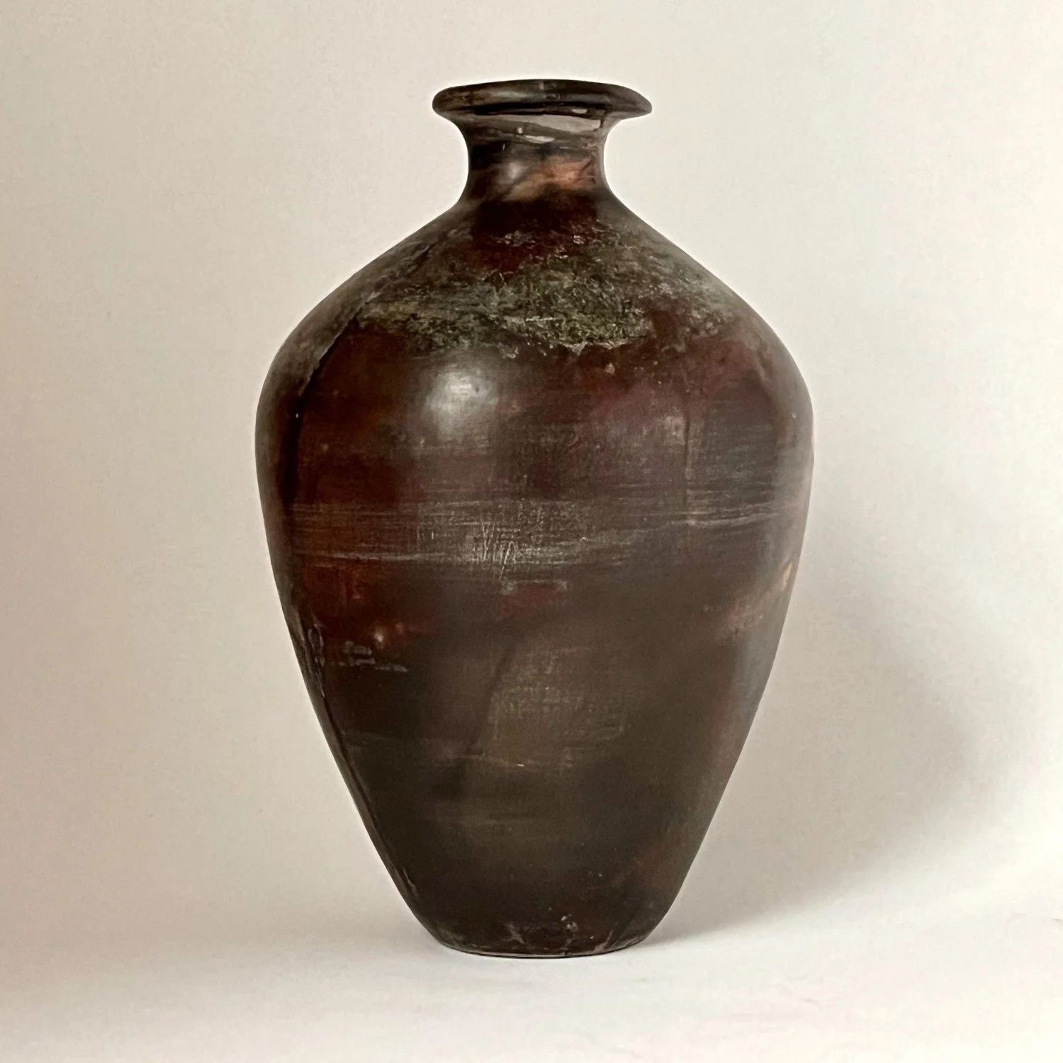Slipcast in mold made from wheel-thrown pot, covered with several layers of white sigillata (fine clay slip) and polished, fired in pit with organic and inorganic materials. Will not hold water.