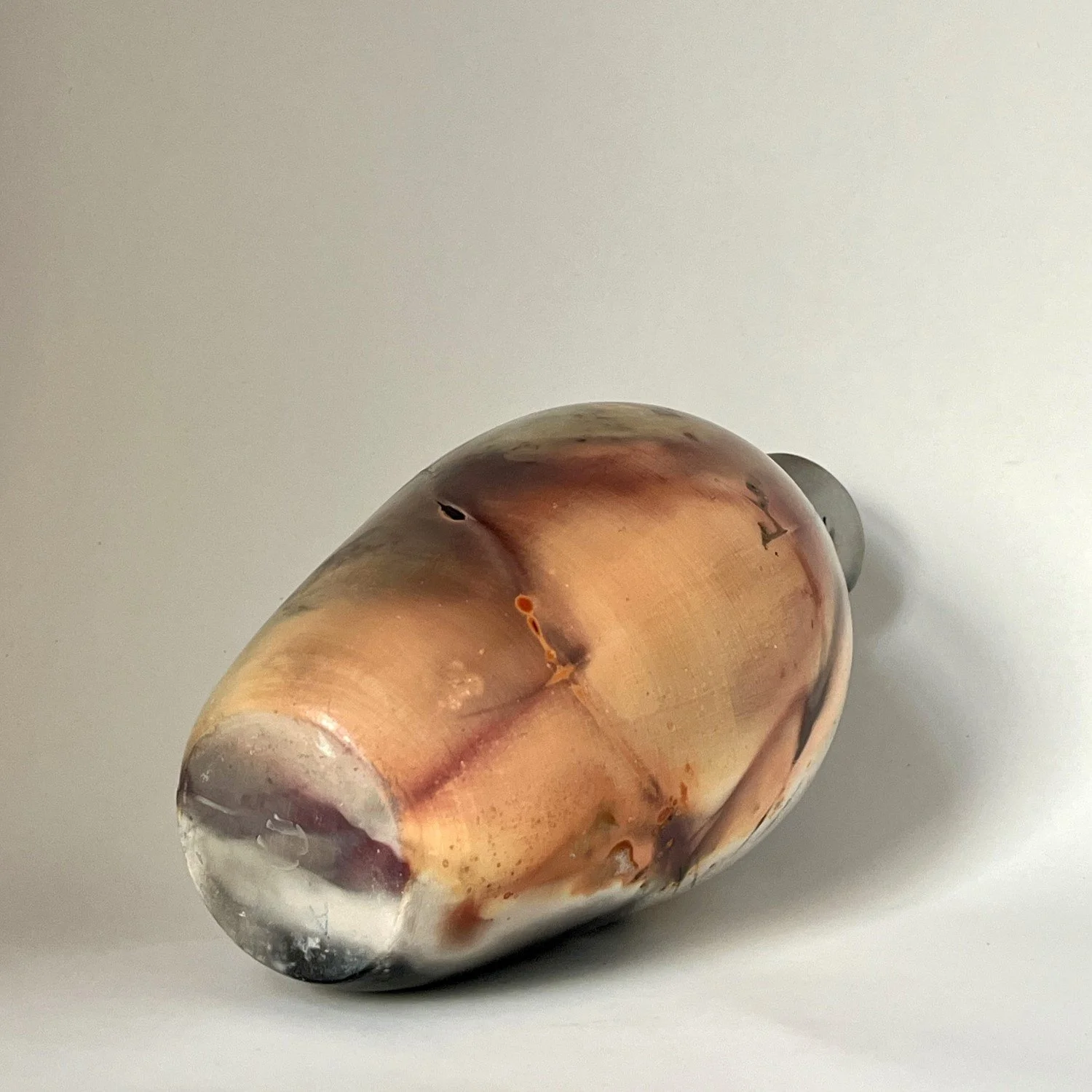 Slipcast in mold made from wheel-thrown pot, covered with several layers of white sigillata (fine clay slip) and polished, fired in pit with organic and inorganic materials. Will not hold water.