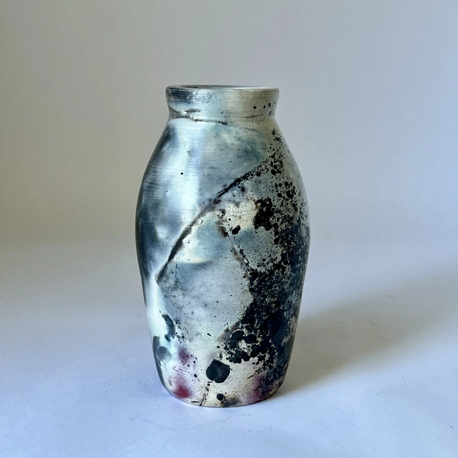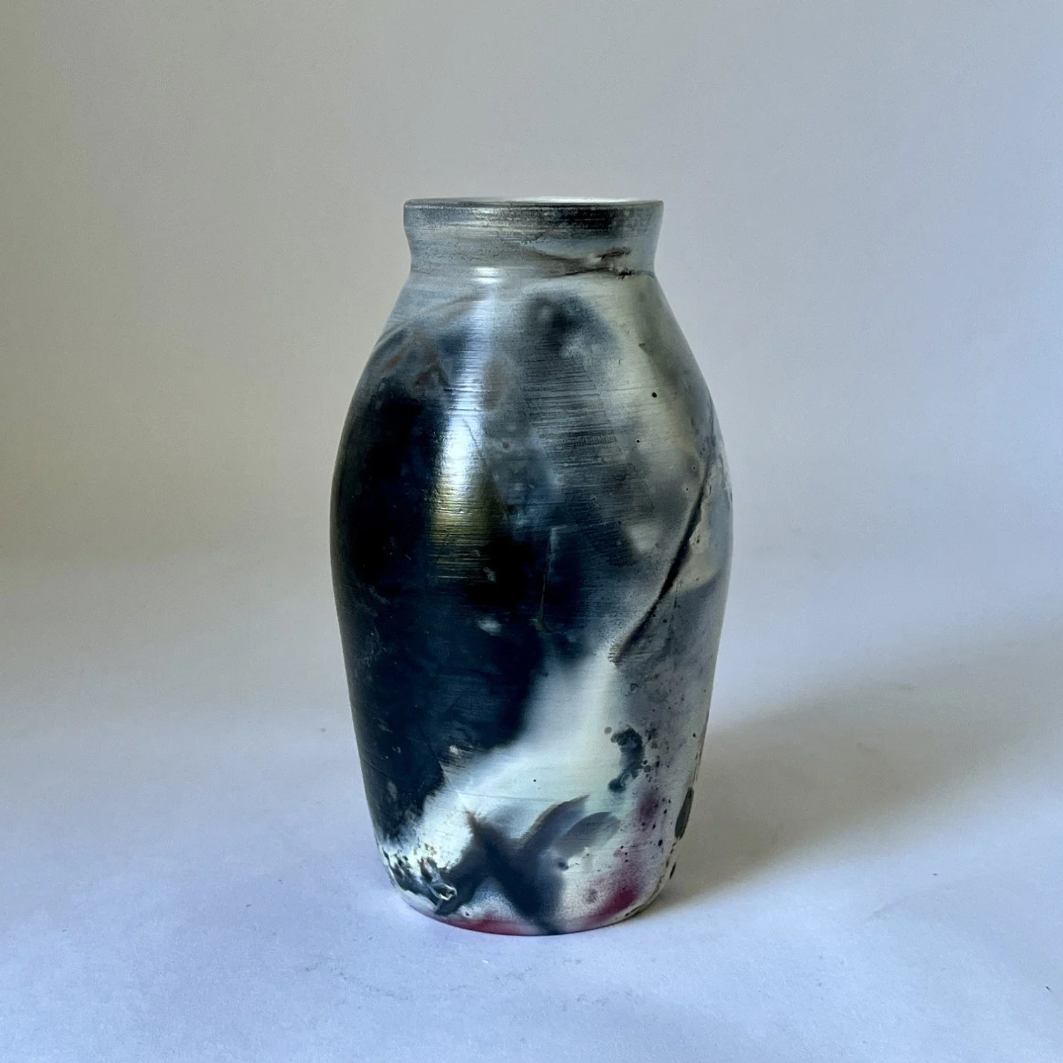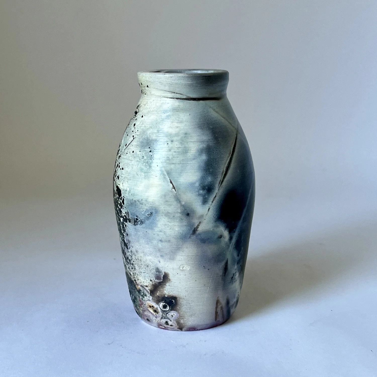 Wheel-thrown, covered with several layers of white sigillata (fine clay slip) and polished, fired in a pit with organic and inorganic materials. Will not hold water.
