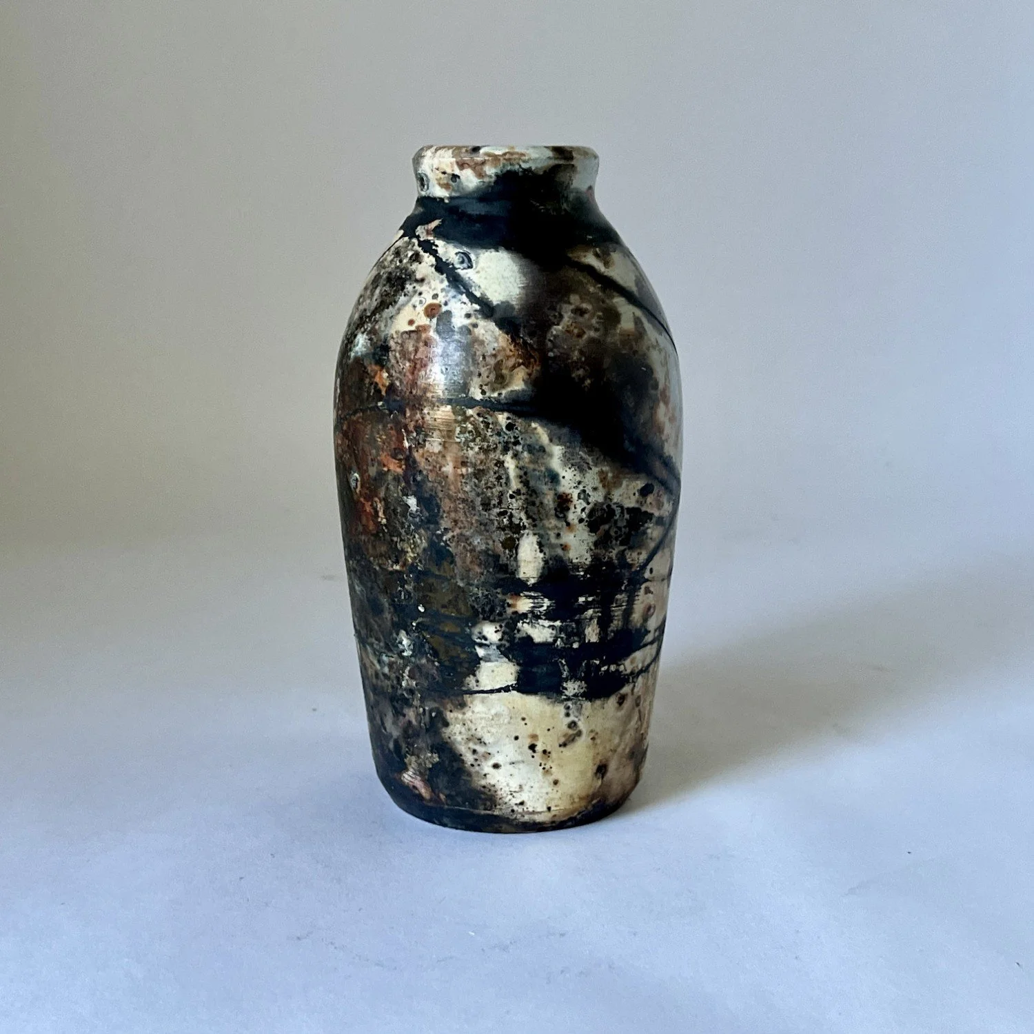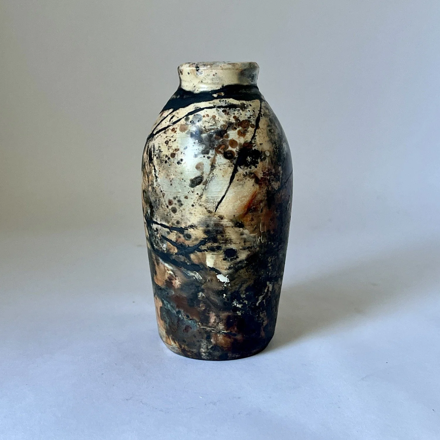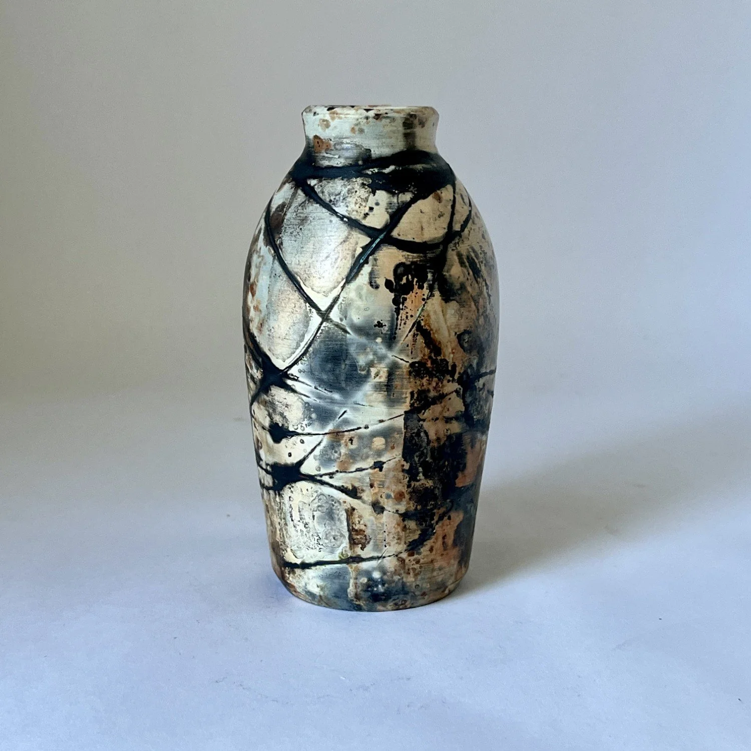Wheel-thrown, covered with several layers of white sigillata (fine clay slip) and polished, fired in a pit with organic and inorganic materials. Will not hold water.
