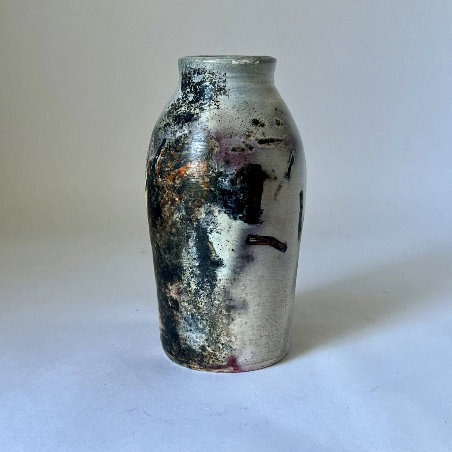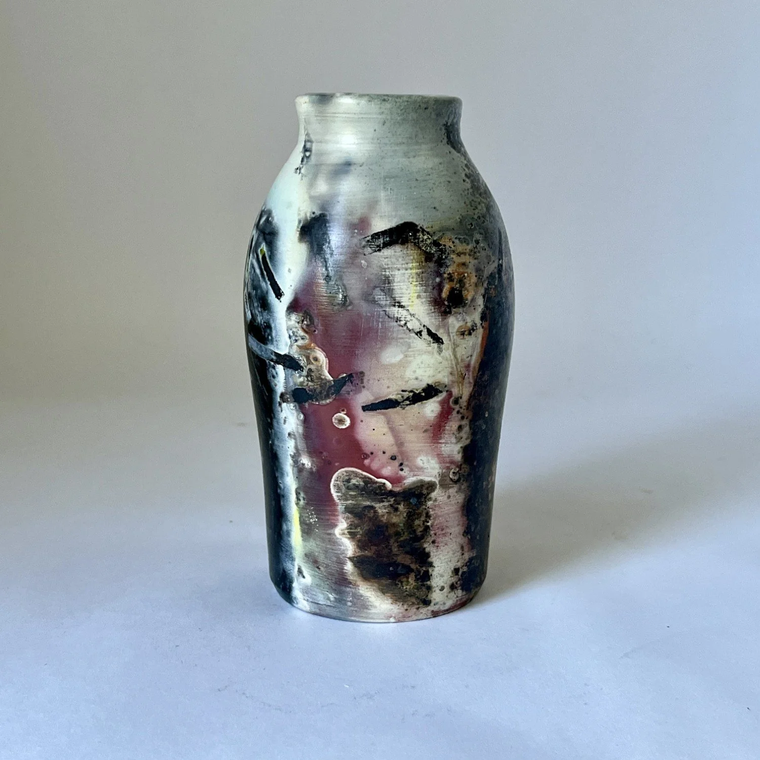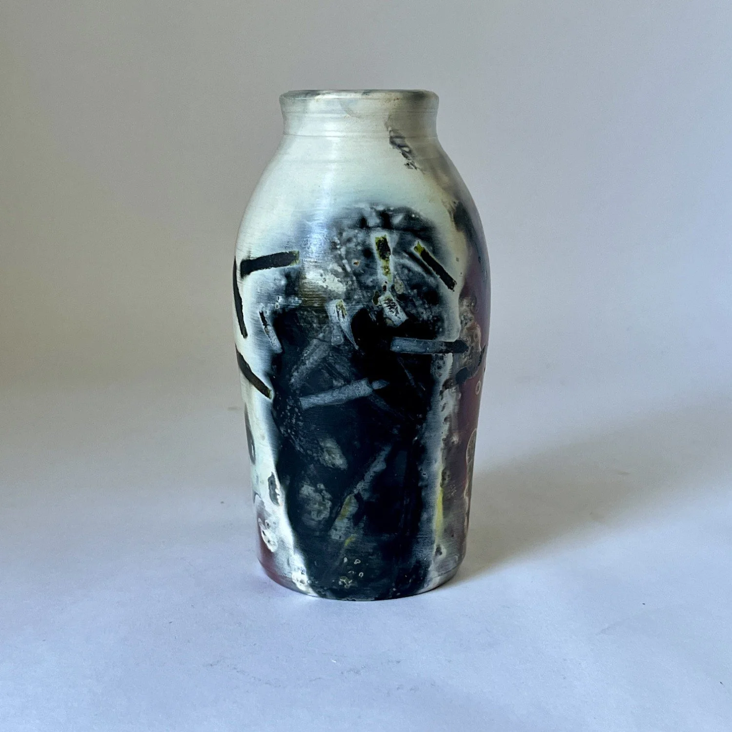 Wheel-thrown, covered with several layers of white sigillata (fine clay slip) and polished, fired in a pit with organic and inorganic materials. Will not hold water.