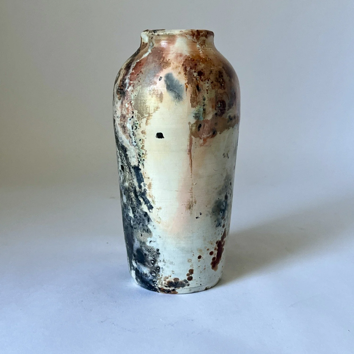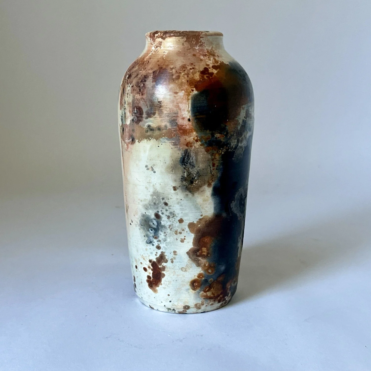 Wheel-thrown, covered with several layers of white sigillata (fine clay slip) and polished, fired in a pit with organic and inorganic materials. Will not hold water.