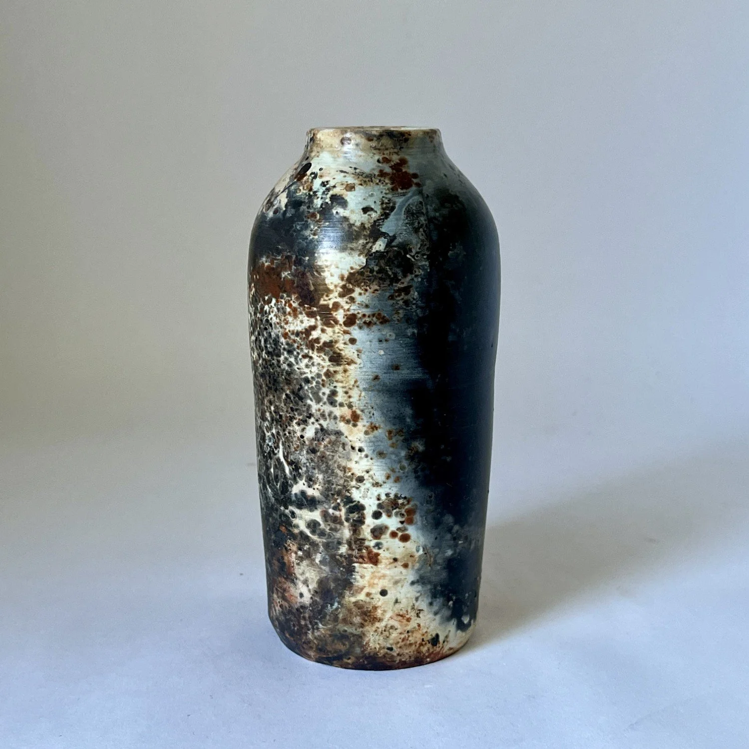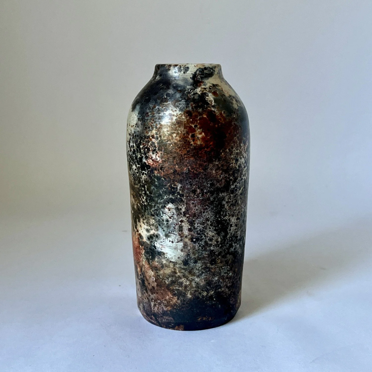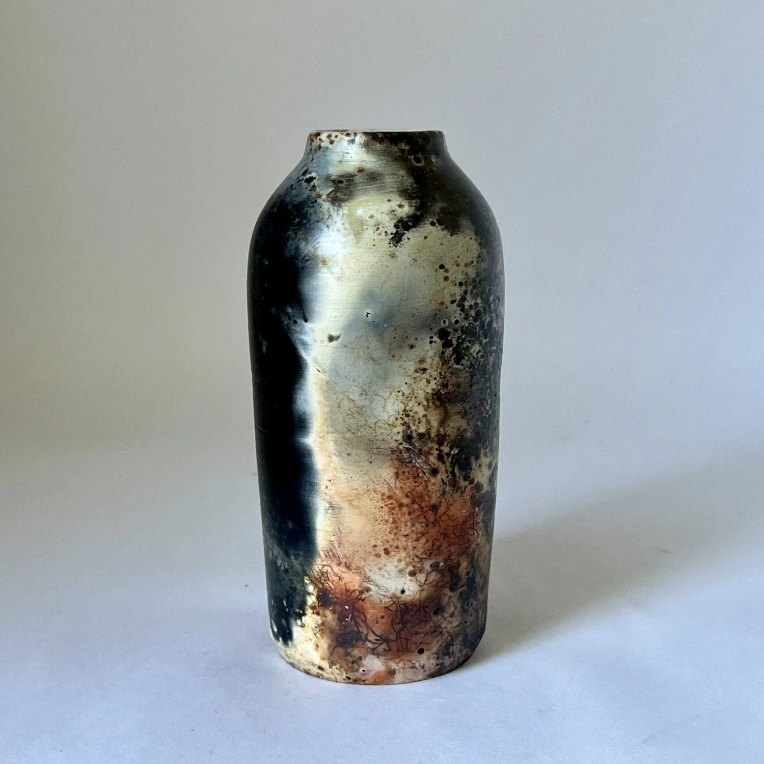 Wheel-thrown, covered with several layers of white sigillata (fine clay slip) and polished, fired in a pit with organic and inorganic materials. Will not hold water.