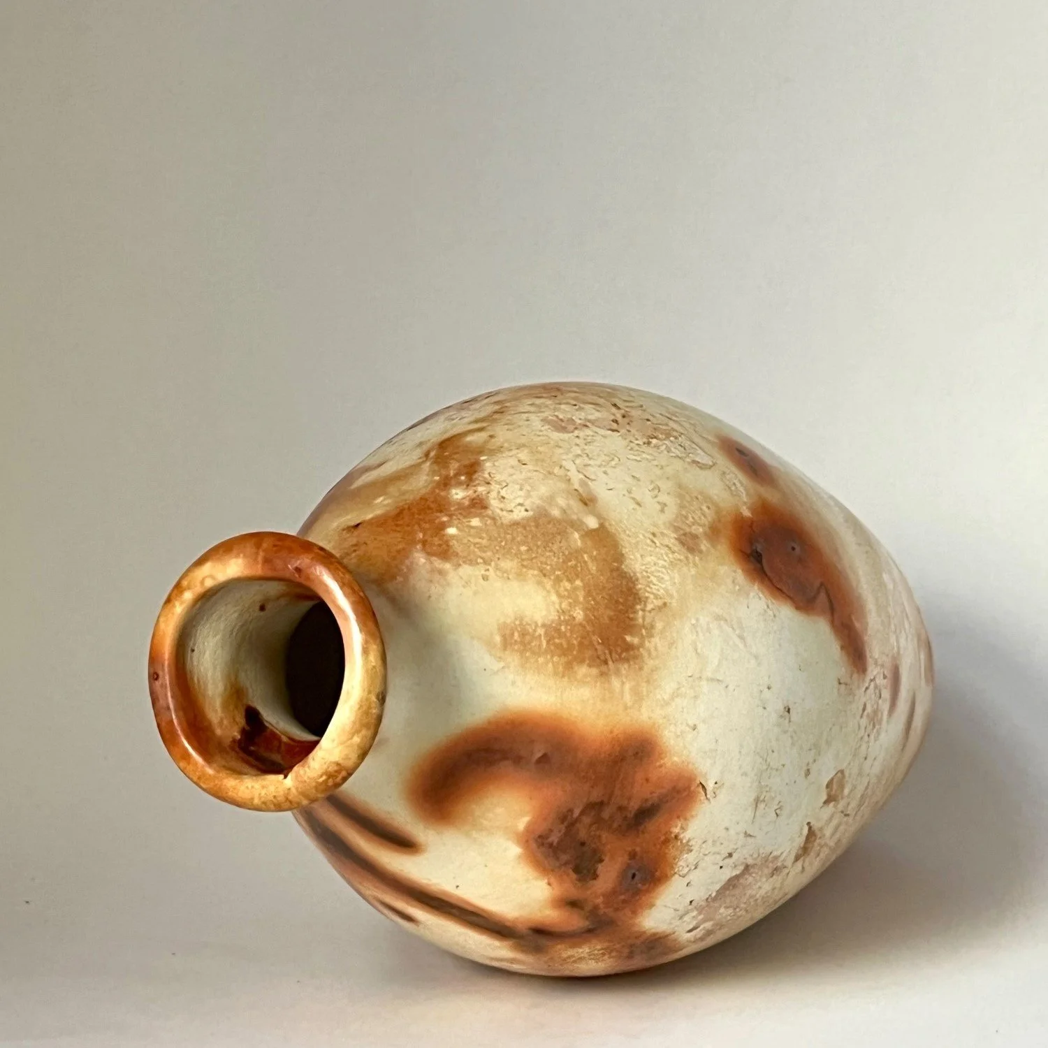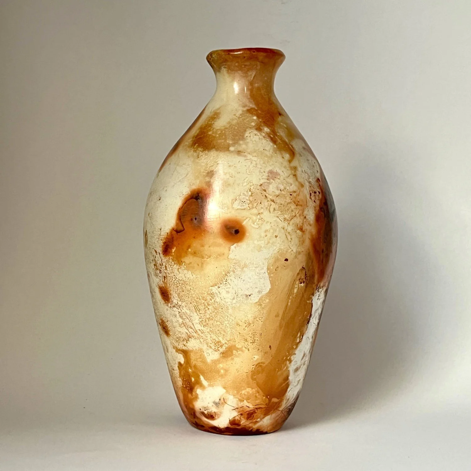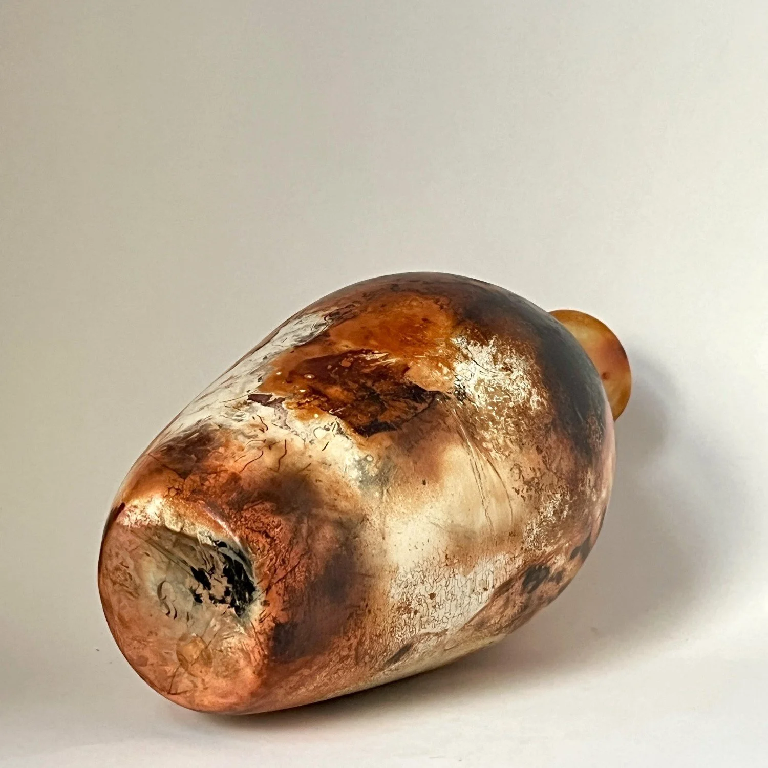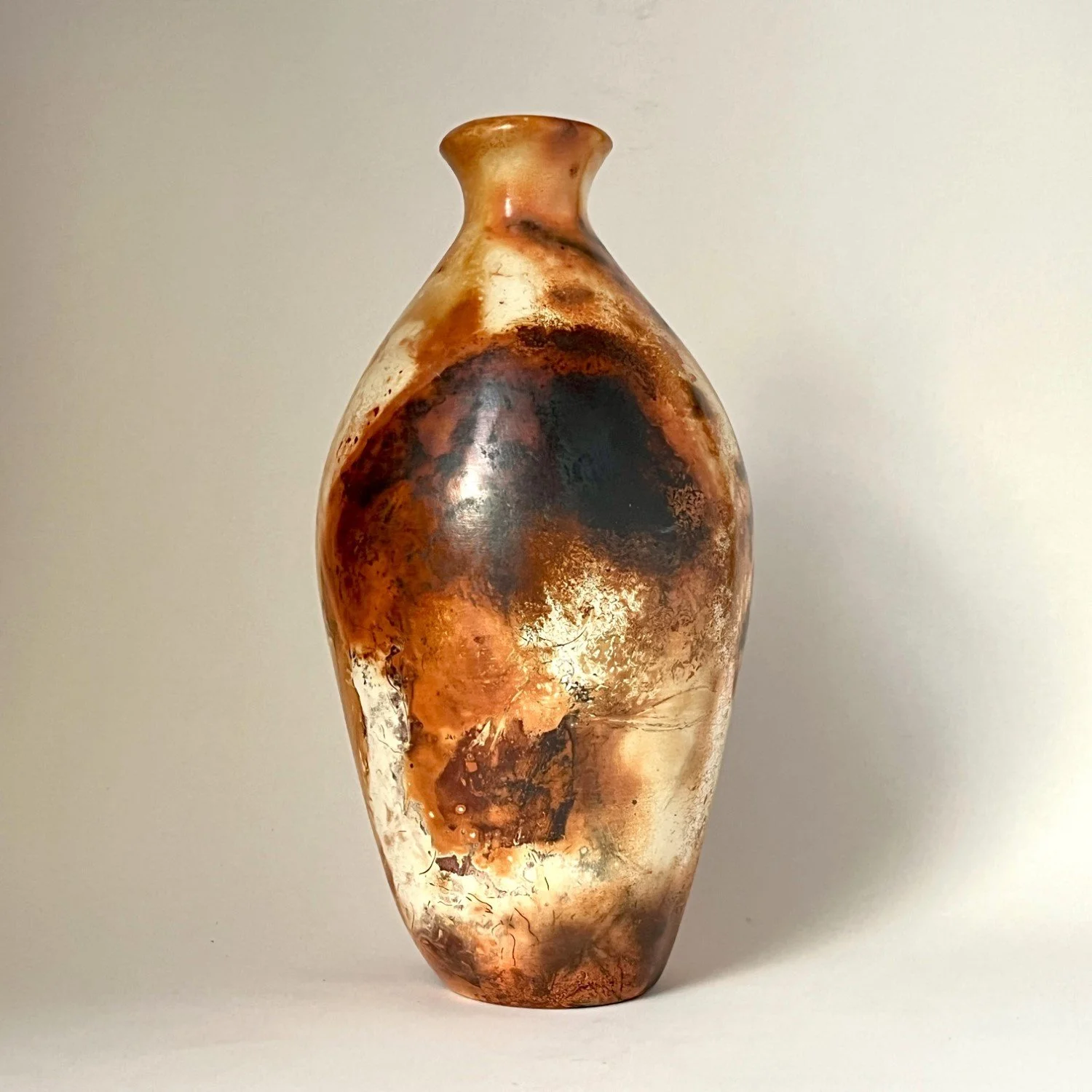 Slip-cast in mold made from wheel-thrown pot, covered with several layers of white sigillata (fine clay slip) and polished, fired in a saggar with organic and inorganic materials. Will not hold water.