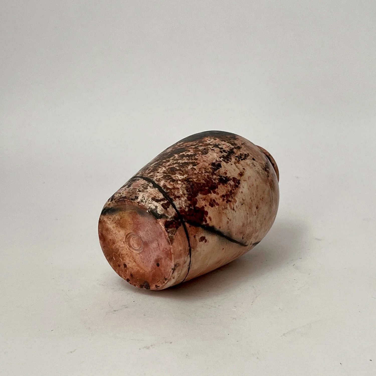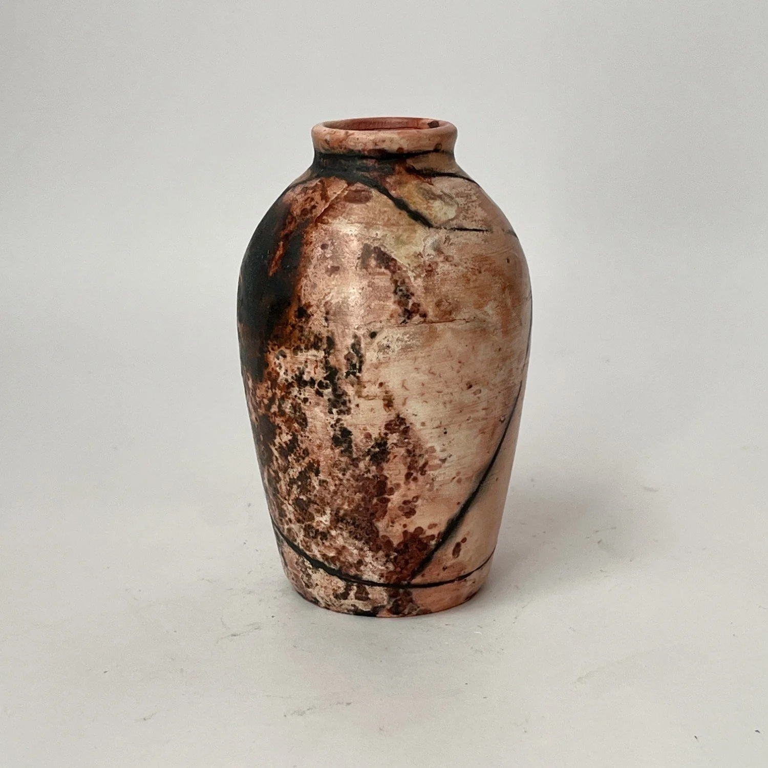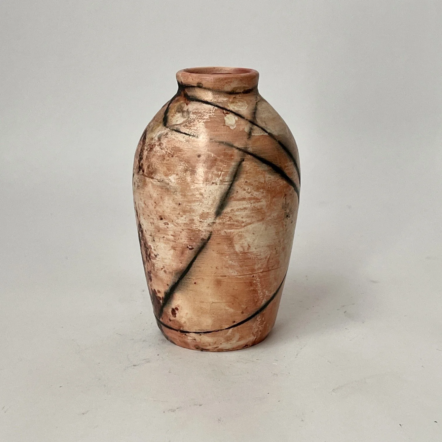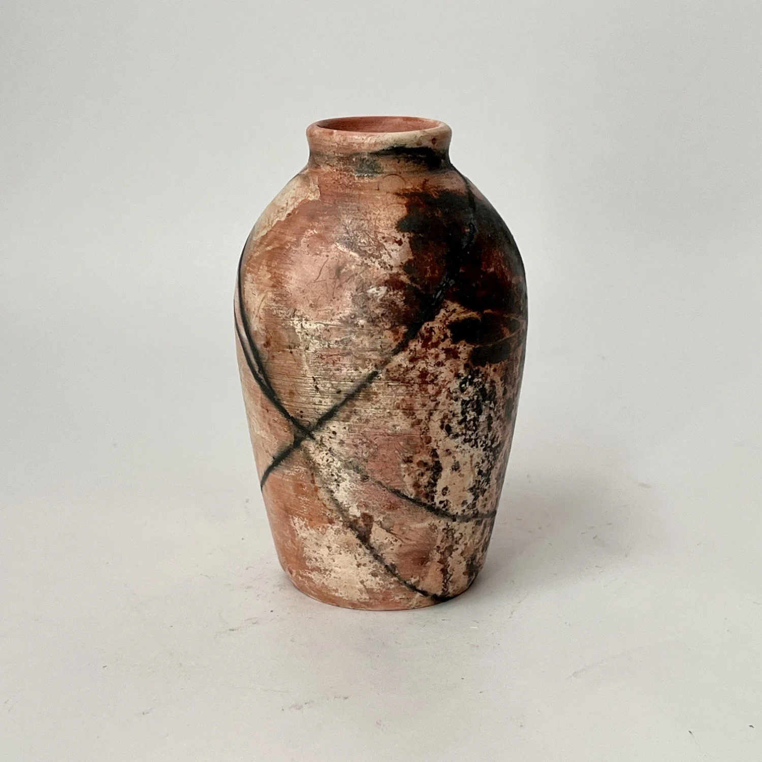 Wheel-thrown, covered with several layers of white sigillata (fine clay slip) and polished, fired in a saggar with organic and inorganic materials. Will not hold water.