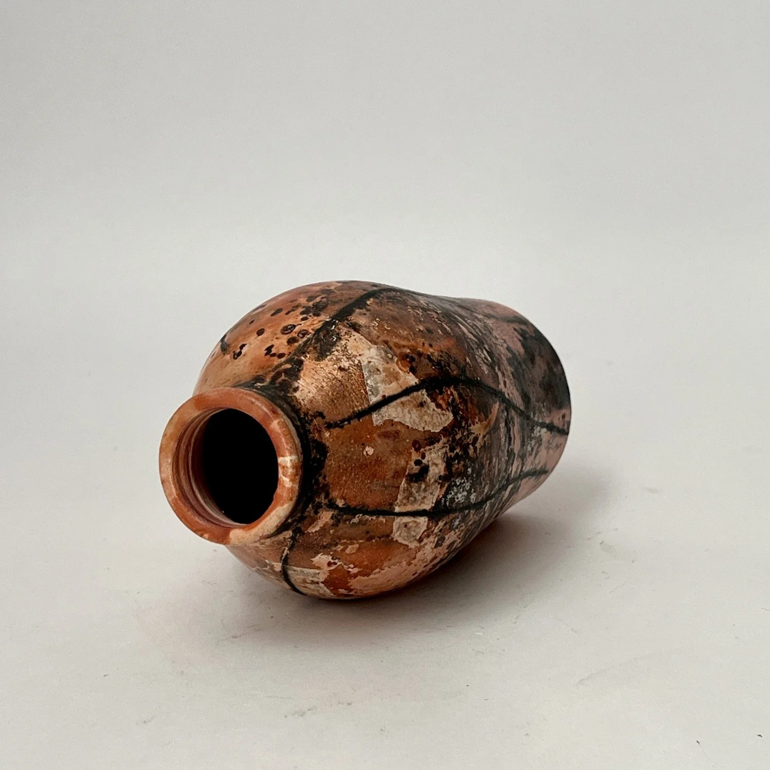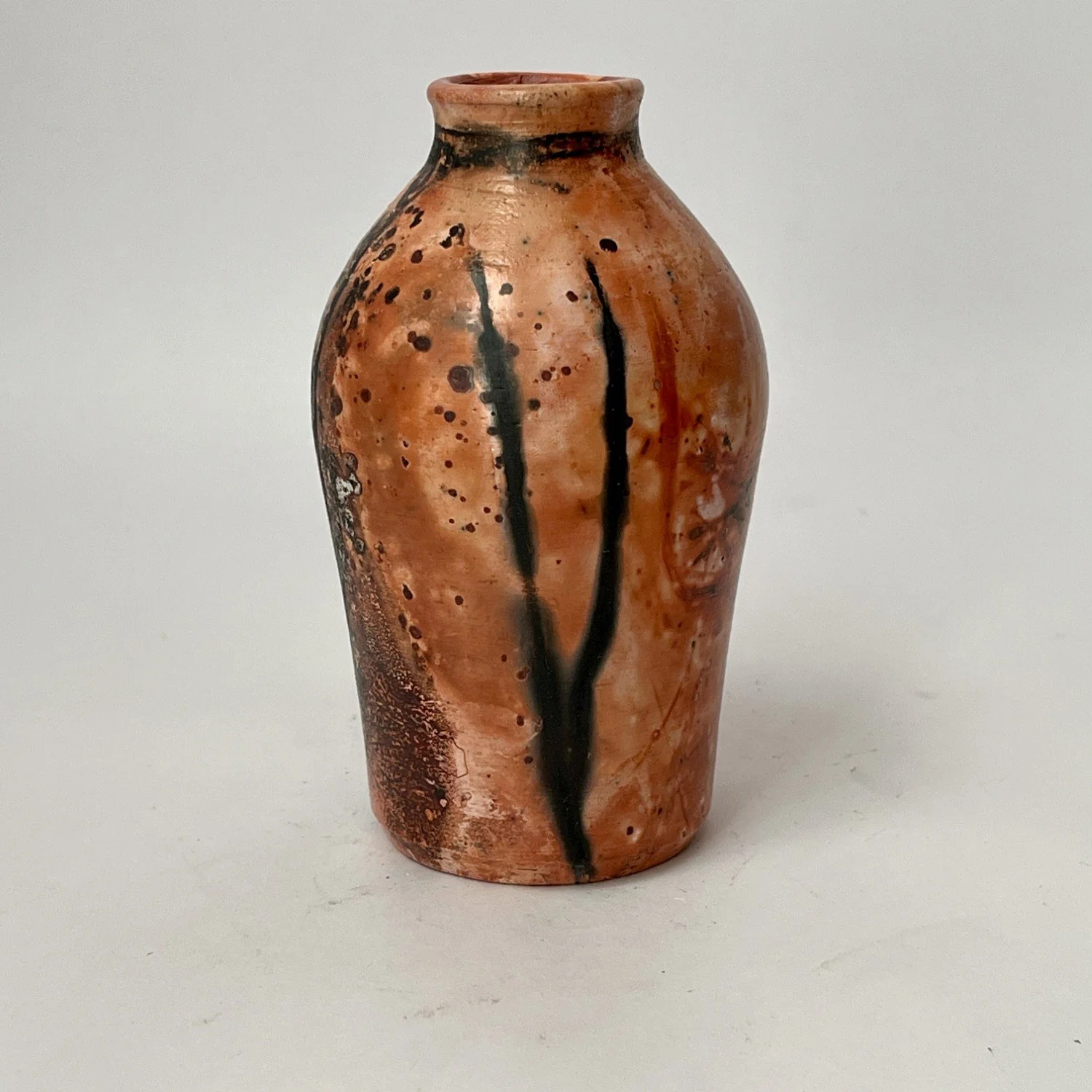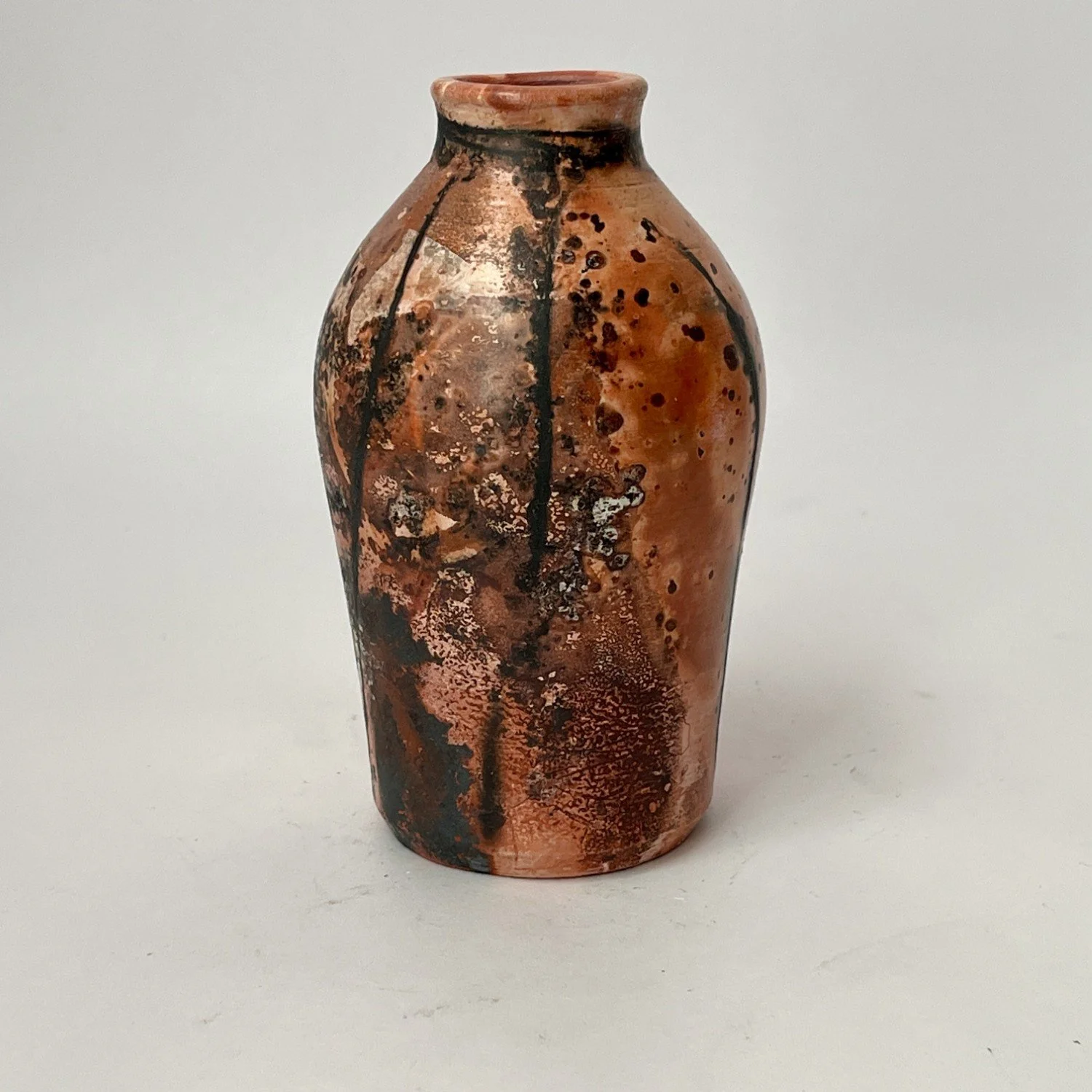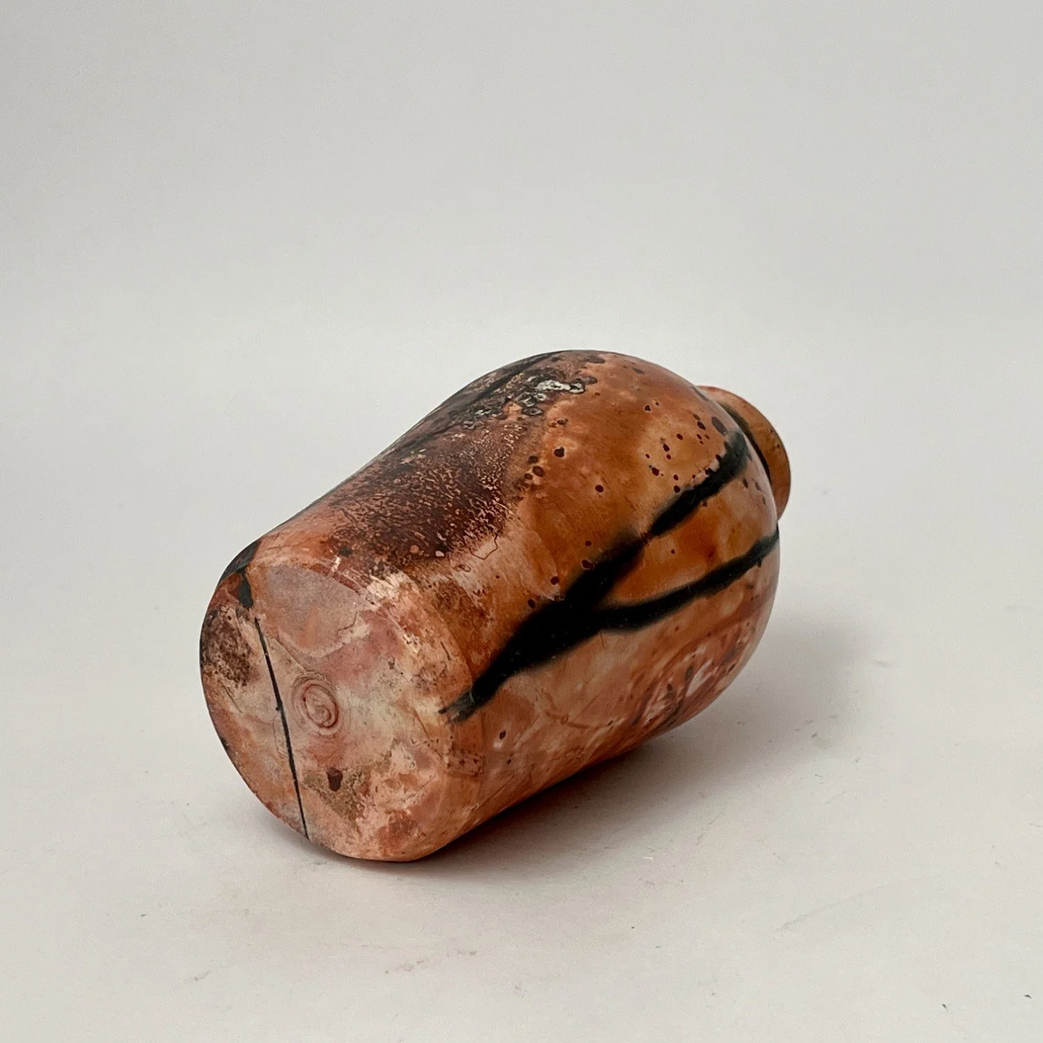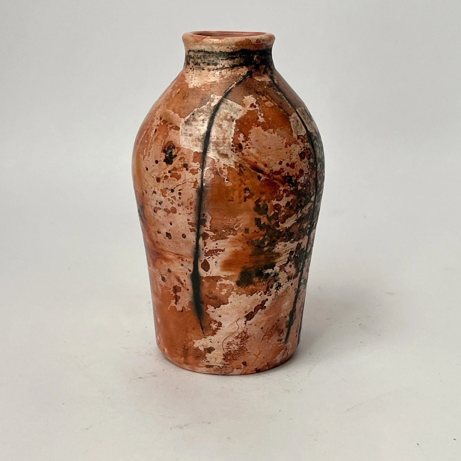 Wheel-thrown, covered with several layers of white sigillata (fine clay slip) and polished, fired in a saggar with organic and inorganic materials. Will not hold water.