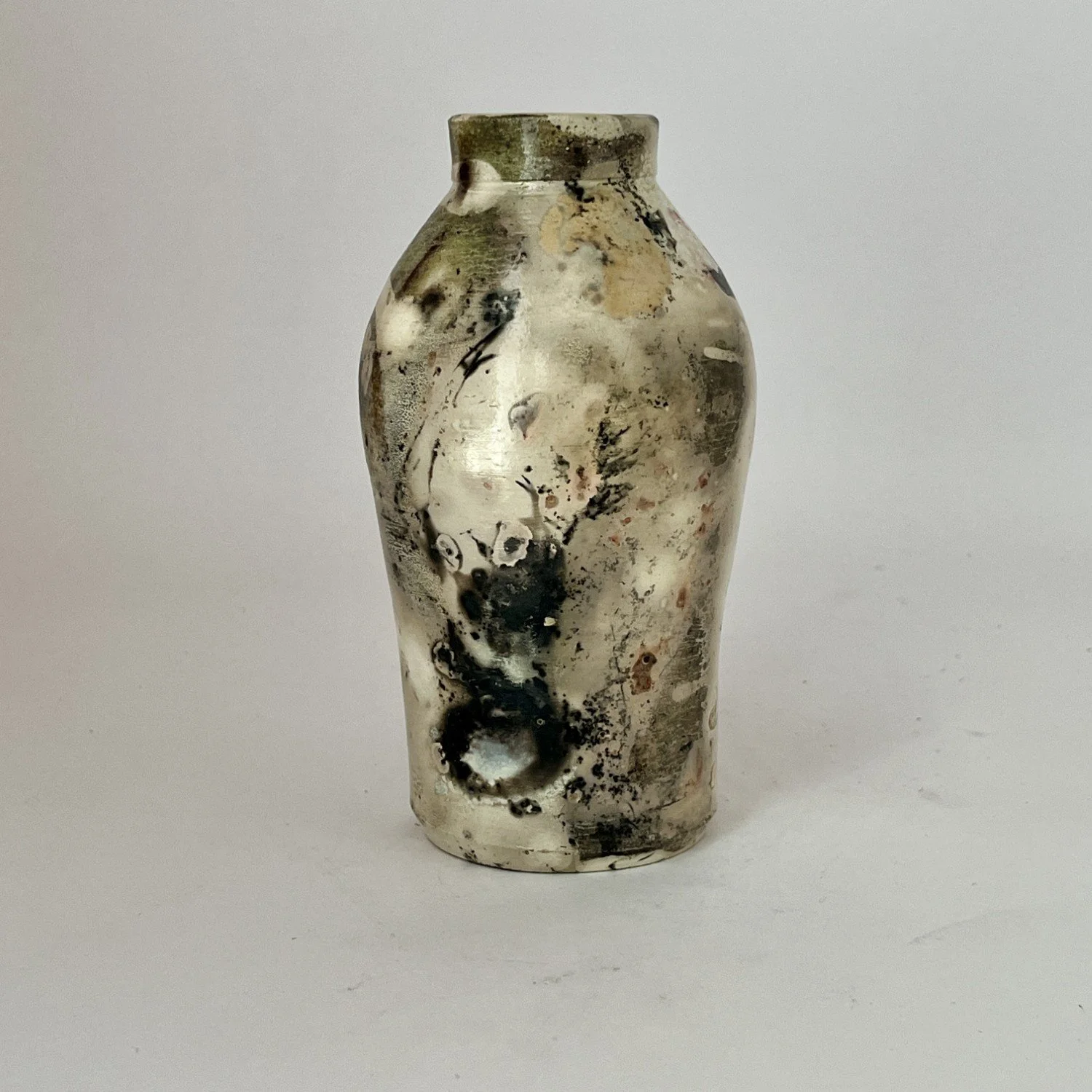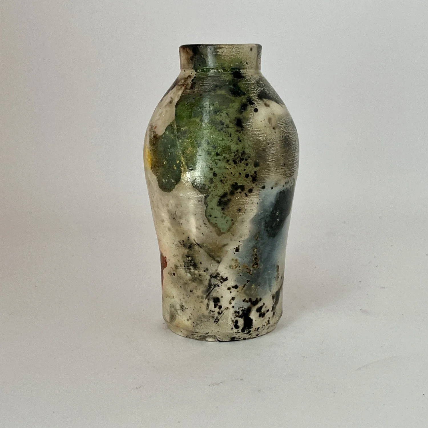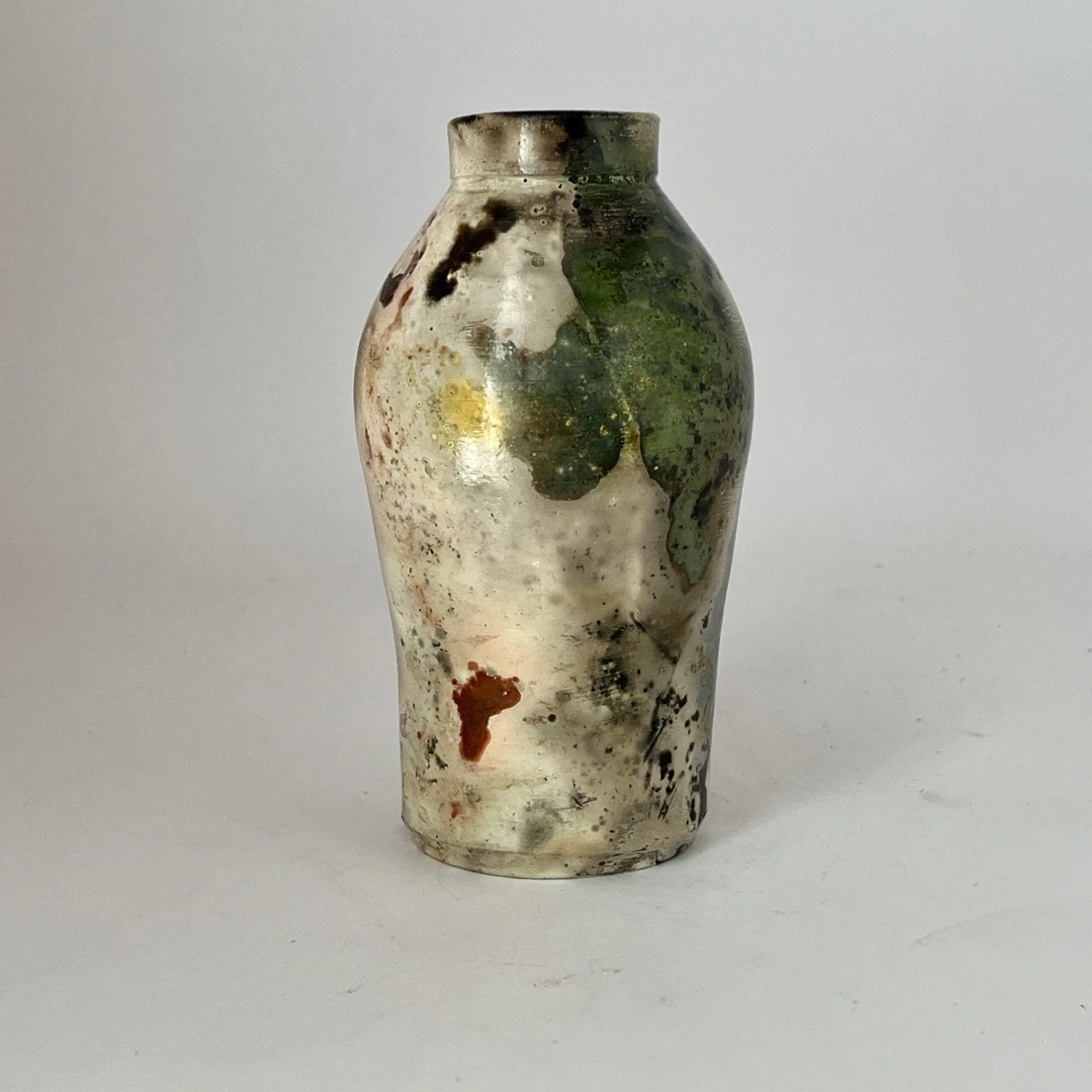 Wheel-thrown, covered with several layers of white sigillata (fine clay slip) and polished, fired in a saggar with organic and inorganic materials. Will not hold water.