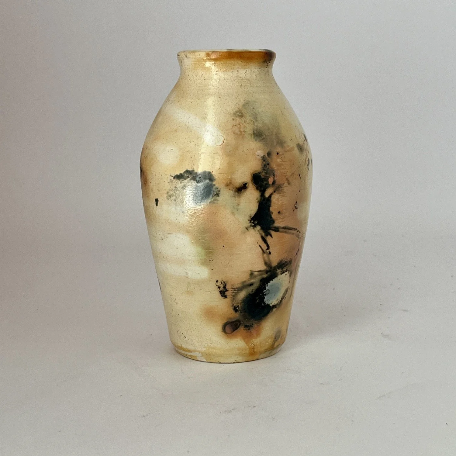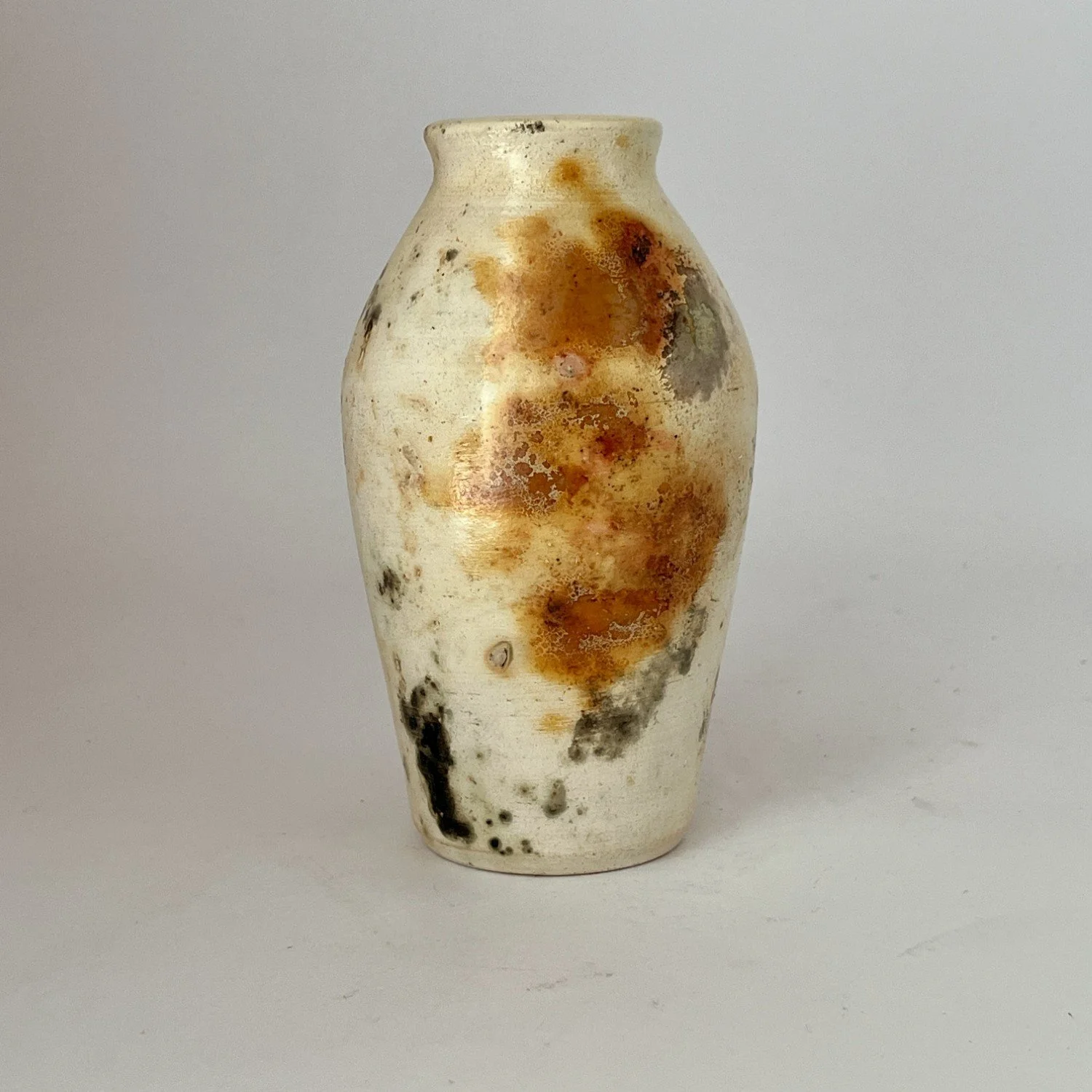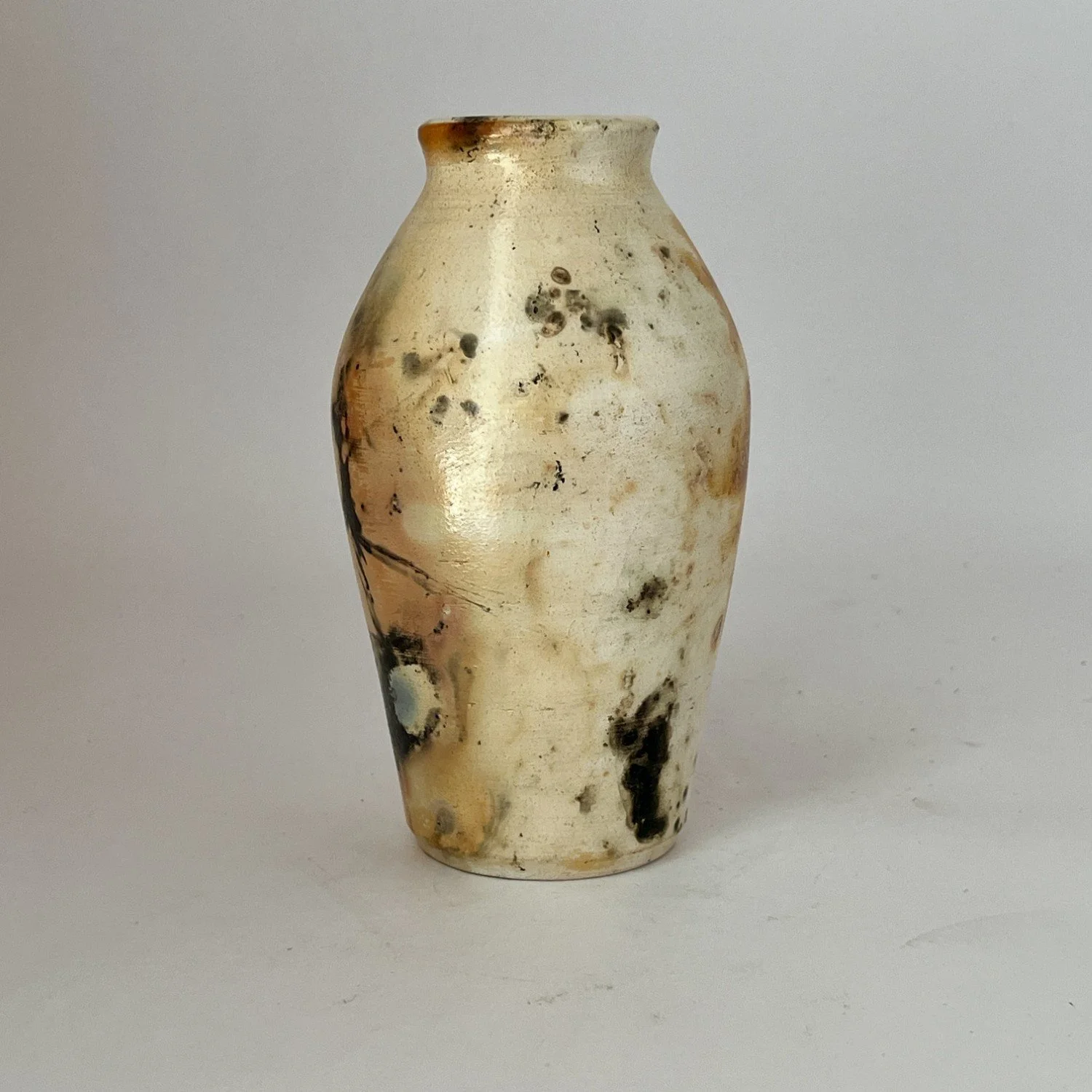 Wheel-thrown, covered with several layers of white sigillata (fine clay slip) and polished, fired in a saggar with organic and inorganic materials. Will not hold water.