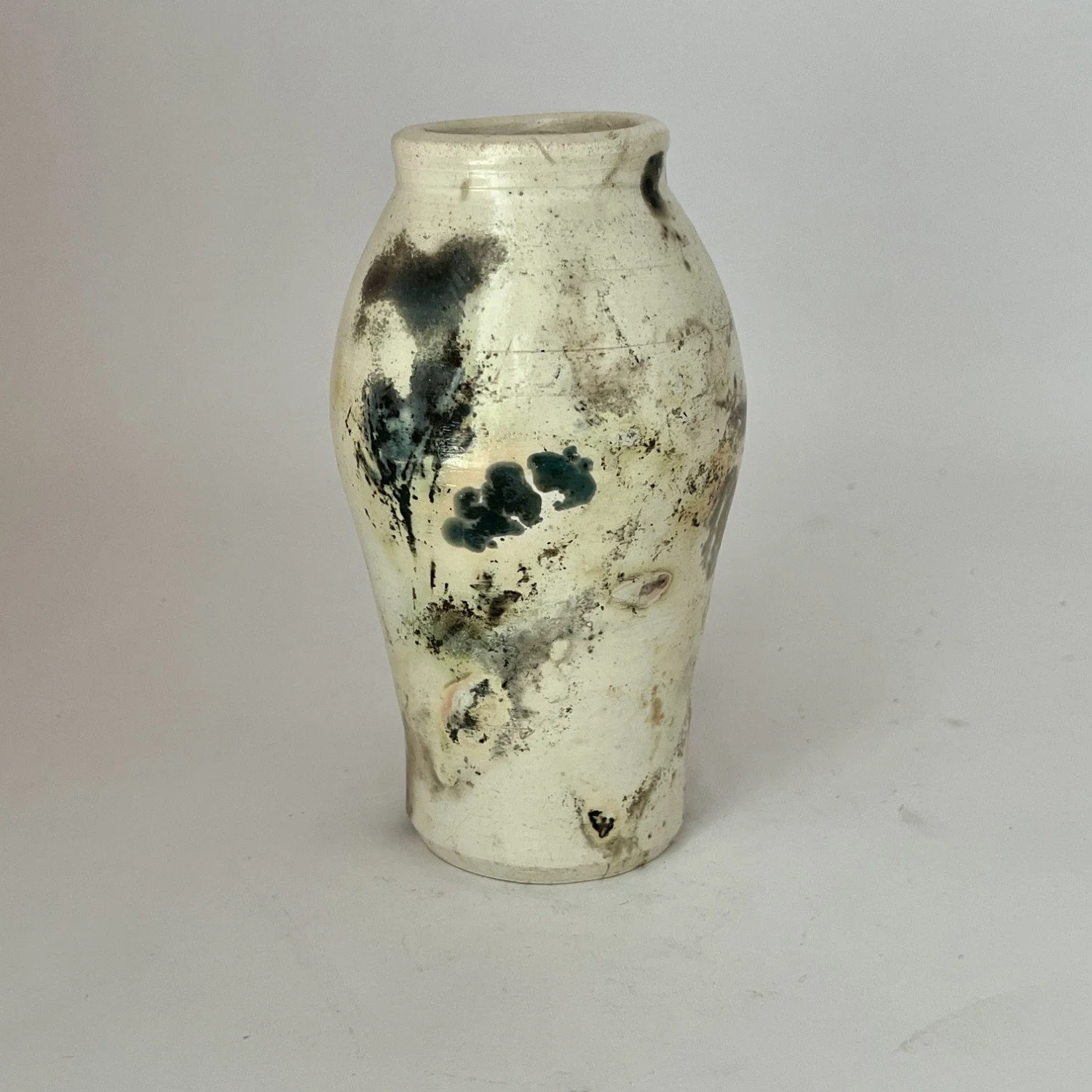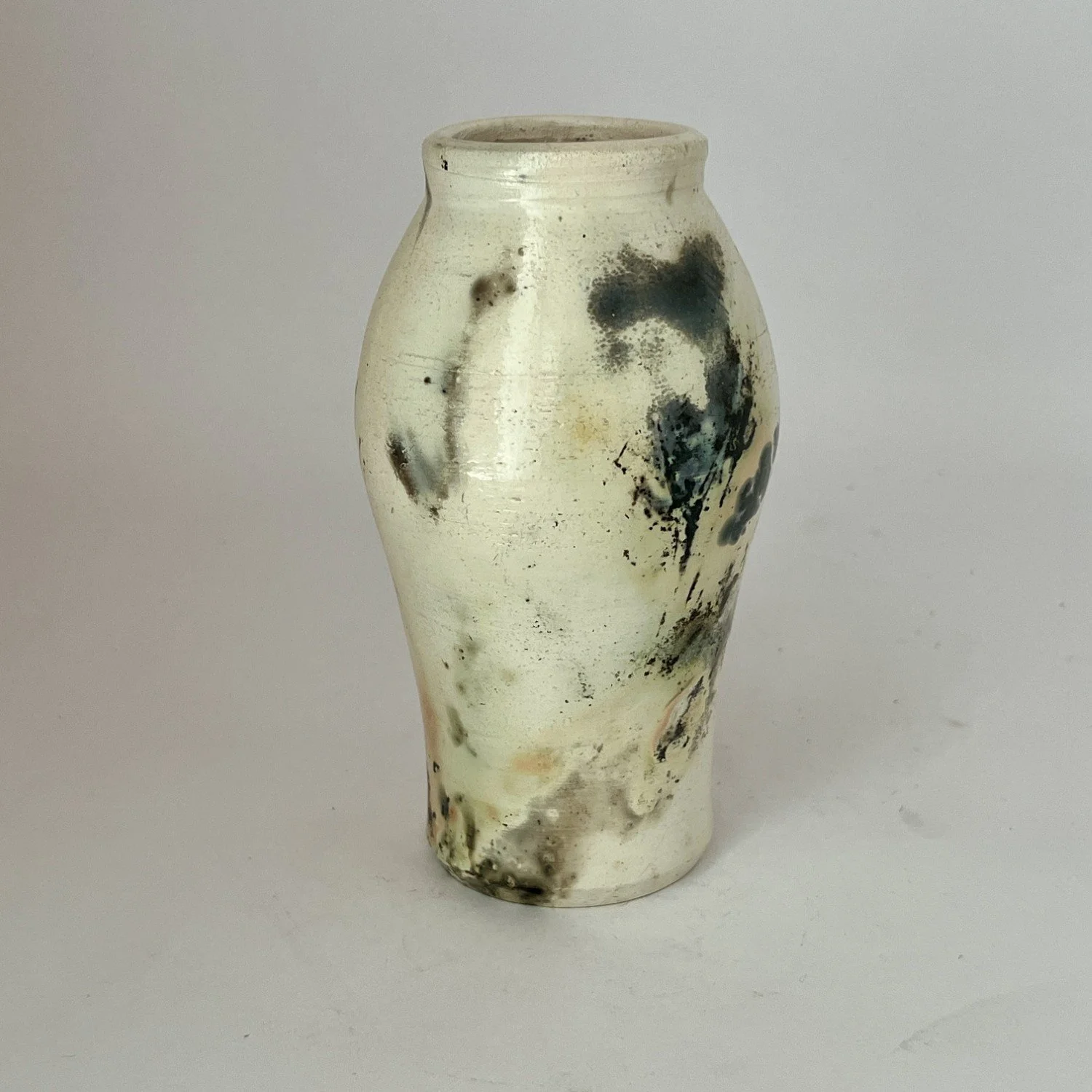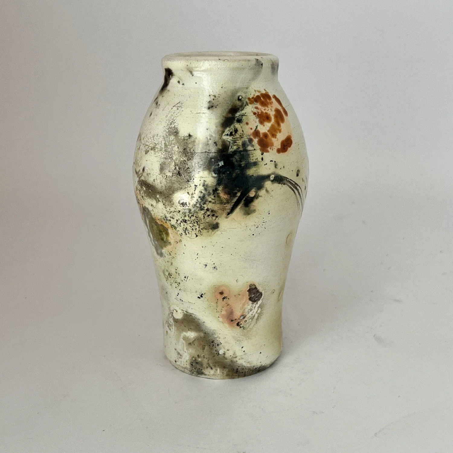 Wheel-thrown, covered with several layers of white sigillata (fine clay slip) and polished, fired in a saggar with organic and inorganic materials. Will not hold water.