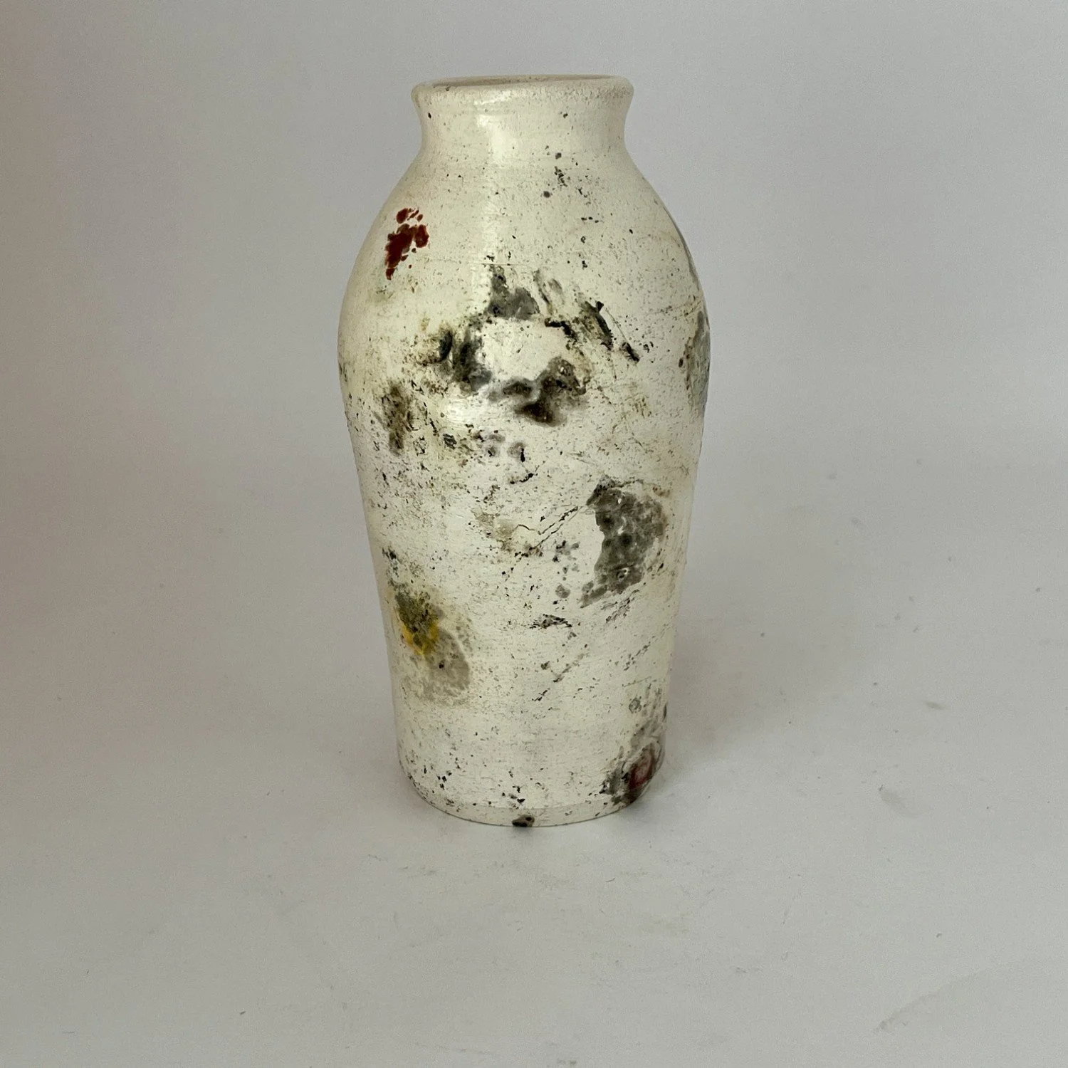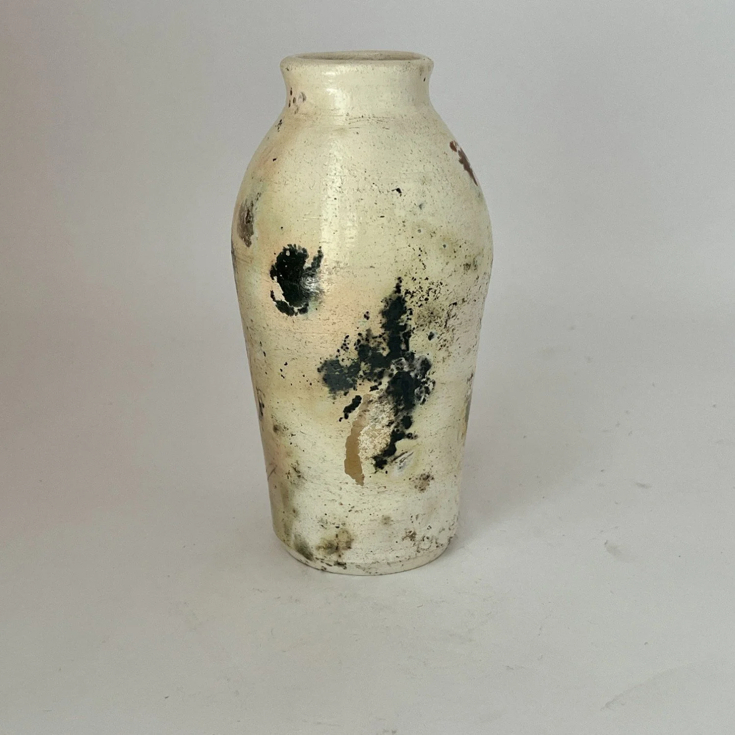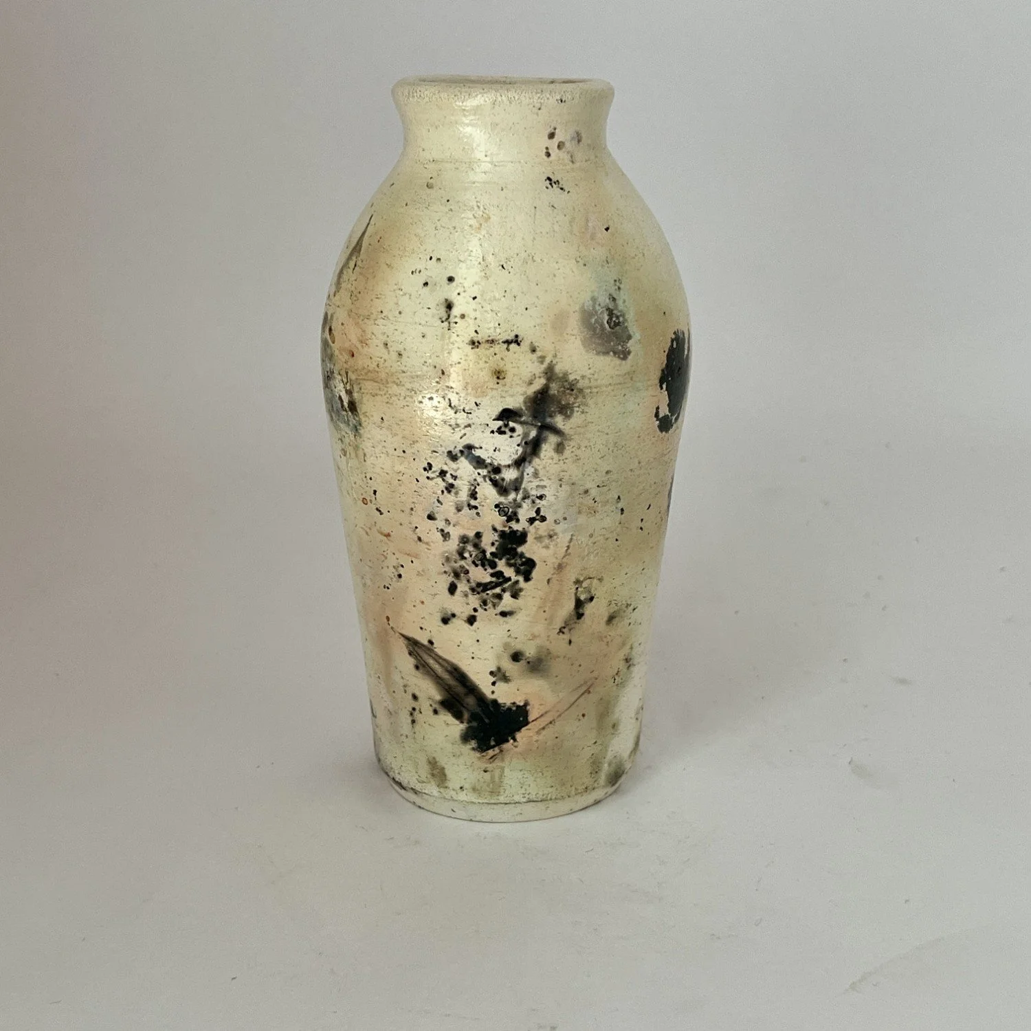 Wheel-thrown, covered with several layers of white sigillata (fine clay slip) and polished, fired in a saggar with organic and inorganic materials. Will not hold water.